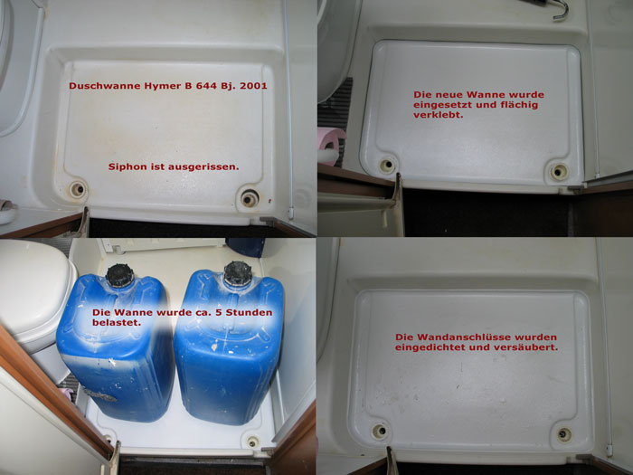 Hallo zusammen, leider ist in meinem Camper-Kastenwagen Bavaria Camp (Knaus, modell Sol Y Sombra, 2003) einer der beiden Abläufe ausgebrochen und es gibt davon ausgehend zwei ca. 6cm lange Risse. Siehe Bilder! Bei meinem Kastenwagen ist die Duschtasse der Durchgang in den Heckbereich mit Stockbett, die Standfläche vorm Kleiderschrank und und der Boden des Bads für Duschen und Toilettenaufenthalt. Ziemlich vielfältig. Ich denke, dass der Schaden durch das Stehen auf dem ungeschützten Duschtassenboden entstanden ist. Möglichweise durch punktuelle Belastung am Ablauf, mit der Ferse oder so. Nachdem ich schon einige Zeit im Forum zu diesem Problem verbracht habe, möchte ich Euch das jetzt kundtun und bin auf Eure hilfreichen Eingebungen gespannt. Meine Herangehensweise wäre... - Ausbau der Wanne (gut zugänglich, mit Silikon abgedichtet, evtl am boden geklebt) - Risse kleben bzw. sonstwie versiegeln (Epoxy?) - größeren Ablauf einbauen Was haltet Ihr davon? Danke und Grüßle Roger Das geht und ordentlich unterfüttern das die Tasse sauber aufliegt. Ich habe im Kasten meine Duschtasse aus Edelstahl fertigen lassen. Die Abflüsse sind tiefgezogen und da muss Ruhe sein. Hallo Roger, im Prinzip kannst du dies so machen. ABER, es kommt darauf an welcher Kunststoff für die Duschwanne verwendet wurde! Bei unserem Eura den wir hatten, bestand selbe Thematik. Leider war die Duschwanne aus ABS der sich nur mit speziellen Klebern geklebt werden kann. Dazu kam, der Ausbau war mir viel zu aufwendig.. Ich habe daher mit Bauschaum die die Duschwanne unterfüttert und von oben eine Prepeg Kohlefaserplatte 4mm (Fa.Hadeg) zugeschnitten und mit Montagekleber vollflächig in die Duschwanne aufgeklebt, an den Kanten natürlich eine saubere Dichtnaht. Die Abläufe hab ich mir mit CFK selbst laminiert. Bavaria Camp hat ja bis zur Übernahme durch Knaus in kleiner Stückzahl und mit viel Handarbeit feine Fahrzeuge gebaut. Da war die Duschwanne sicher ein Zukauf Teil aus dem Großhandel. Ich würde erst mal bei den "üblichen Verdächtigen" Großhändlern schauen, ob die eine passende Wanne im Sortiment haben. Z.B. Reimo: --> Link Wenn du mal im Norden Urlaub machen möchtest --> Link Bei entsprechender Terminierung, kannst du es am Montag abgeben und vielleicht am Abend wieder mitnehmen, oder iene Nacht in einem Hotel verbringen. Ich war zufrieden, die bauen aber auch meine Jolle und verstehen was von GFK. Danke aus dem Südwesten für Eure brauchbaren Hinweise aus Nord (udob) und Süd (stegi)! Ein guter Ansatz ist auch jener von Halbvette Venus. Wenn diese Duschwanne tatsächlich in Großhandelzulauf war, könnte ich Mal nachstochern. Die Duschtasse hat das Rechteck-In-etwa-Einbaumaß mit zwei Abläufen vonn 66 cm x 67 cm. Gleich hänge ich Mal ein Bild davon an. Vielleicht erkennt jemand von Euch sogar Resemblenz. I.Ü. kommt diese der Sache schon sehr nahe.--> Link Viele Grüße aus dem "Vierländereck" Hallo nochmal, da gab es einen Zahlendreher, es handelt sich um 66 x 76 cm +/- 0,5 cm. Auch der Link ist ungeeignet. Hier noch ein Bild. Das scheint tatsächlich eine Modifikation dieser Wanne zu sein, oder? Seitlich gekürzt, sogar die Noppenanzahl stimmt. Das wäre ja MEGA! --> Link Was denkt Ihr? Danke vorab Bei dir sieht es so aus, als ob man die alte Duschwanne einfach ausbauen kann und es noch "Ersatz" gibt. (Bei mir hätte man das ganze Bad zerlegen müssen) Dann würde ich auch diesen Weg wählen! Auf dem Bild sieht die neue Wanne ja vernünftig aus. Was du unbedingt beachten bzw. prüfen musst, dass der Unterbau möglichst überall an der Duschwanne anliegt. So dass beim betreten nichts nachgeben kann. Ansonsten sind die nächsten Risse vorprogrammiert! Hey Ronny und danke für die Hinweise. Das ist echt krass, dass diese 23 Jahre alte Wanne noch verfügbar ist und einfach sowie geradlinig eingebaut ist. Was ist von der Idee zu halten, wenn ich die neue Duschtasse einfach auf die alte drauf setze, sofern die beiden genau aufeinander passen. Dann sollte dich gute Unterfütterung bestehen. An den Abläufen könnte ich noch Bausschaum einfüllen. Viele Grüße