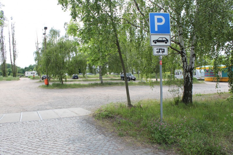 Ausgewiesener naturnaher PKW/Wohnmobil-Parkplatz in der Nähe des Rosarium´s (Rosengarten). Parkplatz auf Schotter/Wiese teilweise schräg und etwas lauter (angrenzende Straße).