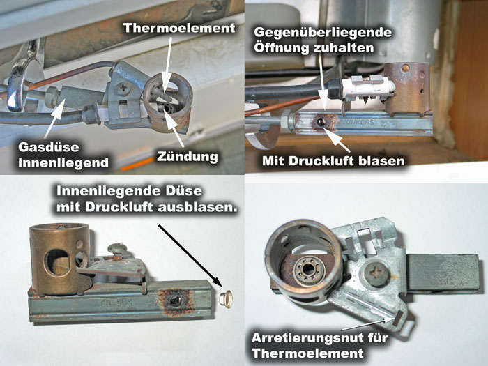 ...dann steckt doch der Kumpel von unserem Insekt drin. sollte auch ohne brennerausbau funzen: gasleitung am brenner abschrauben. plastetüte über das anschluszloch (um die düse zu "fangen") druckluft in die "luftlöcher" blasen. vorsicht, dasz du das düsenblättchen nicht verlierst, das soll in der tüte landen! allesbleibtgut hartmut Servus Volker Also ich hab schon sehr viele Kühlis wieder zum laufen gebracht. Allerdings noch nie ne Flamme aus diesem Loch gesehen. Meine Vermutung : Du hast das was im Brenner liegt nicht rausblasen können. Versuch doch mal Folgendes : Links vom Brenner ist ne 11er Sechskant Mutter zu sehen. Schaub die auf, dann könntest den losen Brenner ev. nach links abziehen. An dieser konischen Mutter steckt vorn drin, im Brenner, die kleine Düse. Dann alles säubern, ausblasen. Zuerst den Abgaskamin, dann den Brenner, die Düse und zuletzt die offen liegende Gasleitung. Hierzu musst den Regler abschrauben und eine 2. Person die Zündsicherung drücken. Viel Erfolg Gruß Kurt