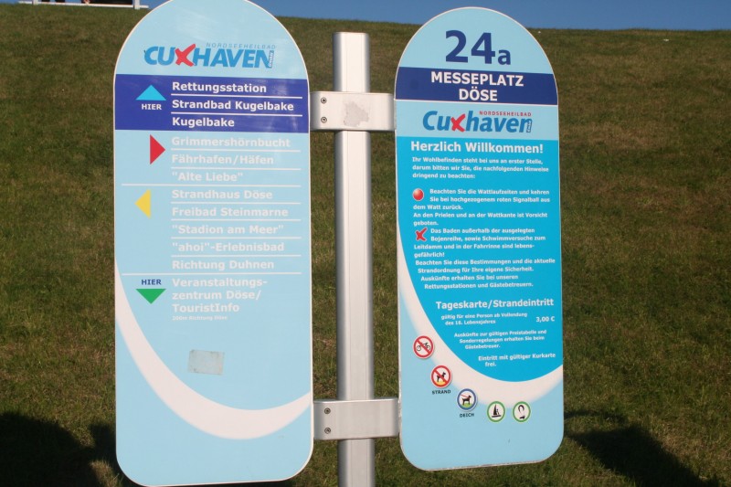 Die Navi-Adresse ist: 27476 Cuxhaven Strandstraße 80 Die Koordinaten: 53°53'26.19"N 8°40'40.08"E Quickinfo: - "kurtaxepflichtiger Parkplatz"(!) für PKW und Reisemobile direkt hinterm Deich an der Nordspitze von Cuxhaven. - 75 markierte Stellplätze auf Stein, einige davon in Überlänge. - 8€/24h inklusive Entsorgung/WC - Versorgung mit Wertmarke Eindruck: Es war nicht viel los, entsprechend parken die PKW kreuz und quer auch auf den WoMo-Plätzen. Das WC ist sauber und benutzbar, über die Duschen kann ich nichts sagen. Die Wasserentsorgung ist über einem Gulli und entsprechend auch ohne Abwasserschlauch möglich. Am Platz sind feste "Futterstände" für den kleinen Hunger zwischendurch in der Kategorie Pizza, Döner, Eis, Fischbrötchen. Da der Platz auch als "Messplatz" bezeichnet wird, kann ich mir vorstellen, das man auch schon mal vor "verschlossener" Schranke steht. An den Strand kommt man nur mit gelöster Kurtaxe, ansonsten verwehrt einem ein "städtischer Raubritter" im Strandkorb den Weg, übrigens an der gesamten Deichlinie von Dösen und Duhnen. In Duhnen kommt man noch nicht mal auf den Deich zur Aussicht auf die See. Über Sinn und Unsinn solcher Methoden kann man streiten, für mich aus dem Südwesten ist sowas jedenfalls unverständlich und sinnfrei. (Wir verlangen in Ludwigshafen/Mannheim ja auch keinen Eintritt für das Rheinufer) Man beachte den Hinweis zum Anmieten eines 2. Stellplatzes ...wie großzügig.... :twisted: Wir haben diesen Stellplatz im Oktober 2011 angefahren. Ziel sollte nur ein kurzer Ausflug auf dem Deich sein. Für 3 Stunden haben wir ein Kurzticket ziehen können. Preis hierbei 2 €. Der Kurtaxe am Strand konnten wir gerade noch entgehen.