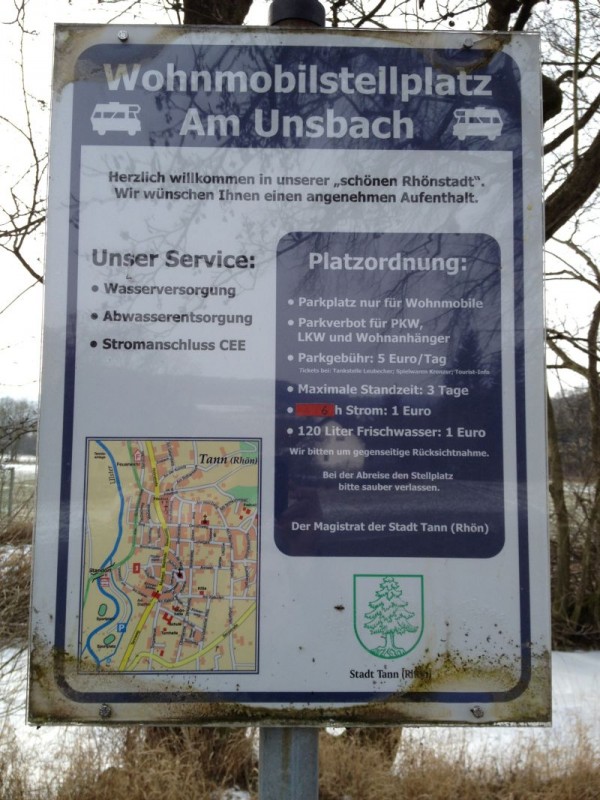 ![]() War am Samstag zu Fuss in Tann und habe auch Bilder gemacht ![]() ![]() Wir wollten am 21.4. zum Stellplatz Tann fahren, um dort zu übernachten. Aber leider war er wenig einladend. Die Entsorgungsstation war umlagert von Sperrmüll aus der Nachbarschaft: Müll, sogar 2 Gasflaschen, Möbelreste, Säcke etc. Außerdem fuhren schon in der kurzen Verweildauer (15 min) mehrere Jugendliche mit Mofas dort rum. Wir sind dann schnell nach Hünfeld weitergefahren. Es ist schade, dass in Tann anscheinend niemand ein wenig auf den Platz achtet. aus dem Pott Alles unverändert. Der Platz ist wenig einladend, und die Bezahlung ist schwierig. Der Weg zur Tankstelle ist unzumutbar weit, das Rathaus ist schon zu, und das Spielwarengeschäft gibts nicht mehr. Die PKWs vom Sportplatz parken auch auf dem Stellplatz zwischen den Womos. Außerdem hat man aufgrund der hohen Bäume keinen Fernsehempfang. Es gibt jetzt einen Automaten zum Bezahlen direkt am Platz. 6,--€ p.N. Auch eine kleine Mülltonne. |