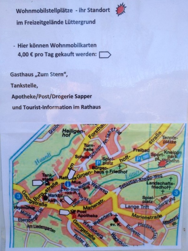 Stromsäulen - 1 € für 10 Std. (manchmal muss man 2 € einwerfen ) V+E Stellplatzgebühr 4 € ist an der Tankstelle, im Fremdenverkehrsbüro/Rathaus oder im Gasthaus Stern in der Ortsmitte zu bezahlen. DieTankstelle liegt etwas versteckt. Stellplatzbild War das Wochenende dort,