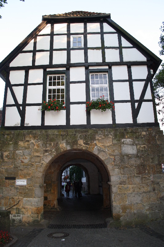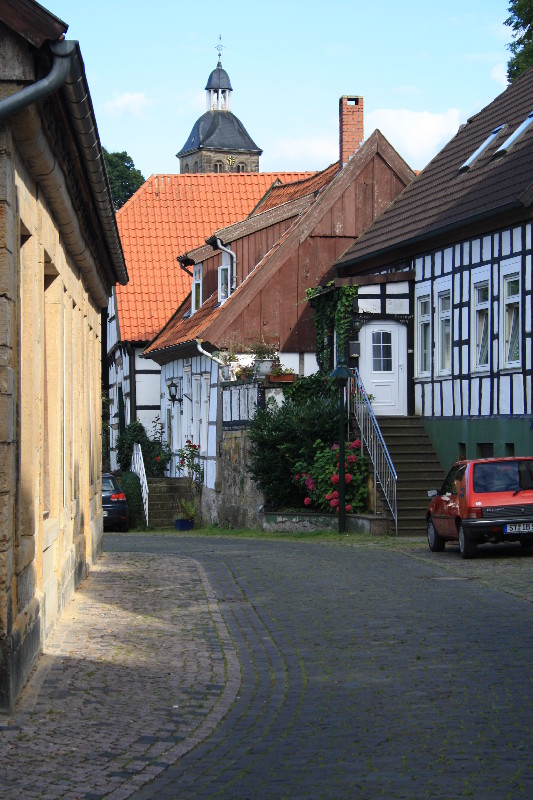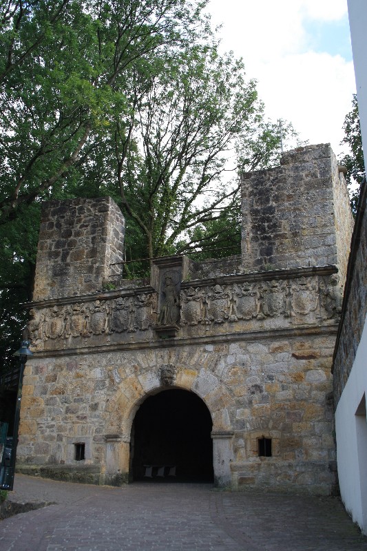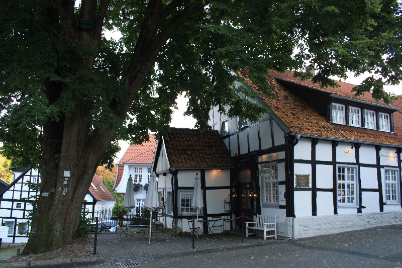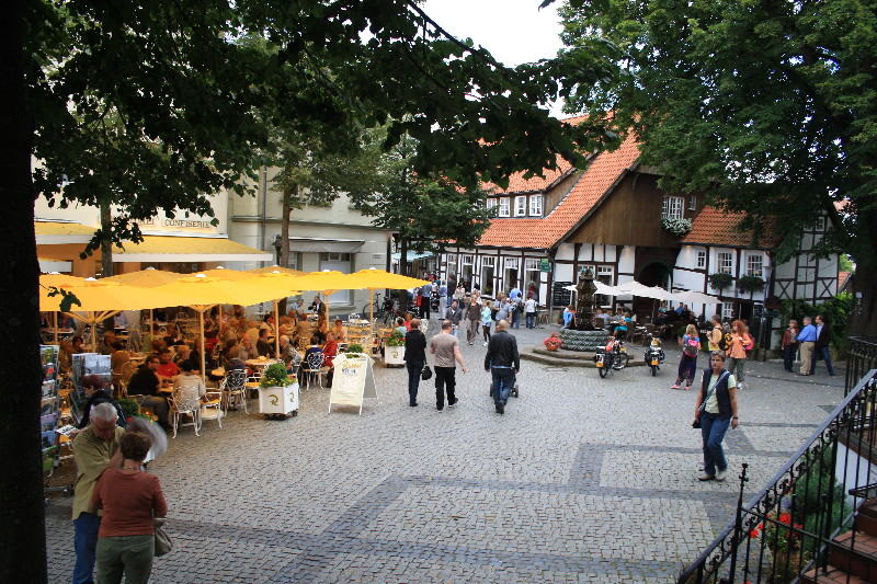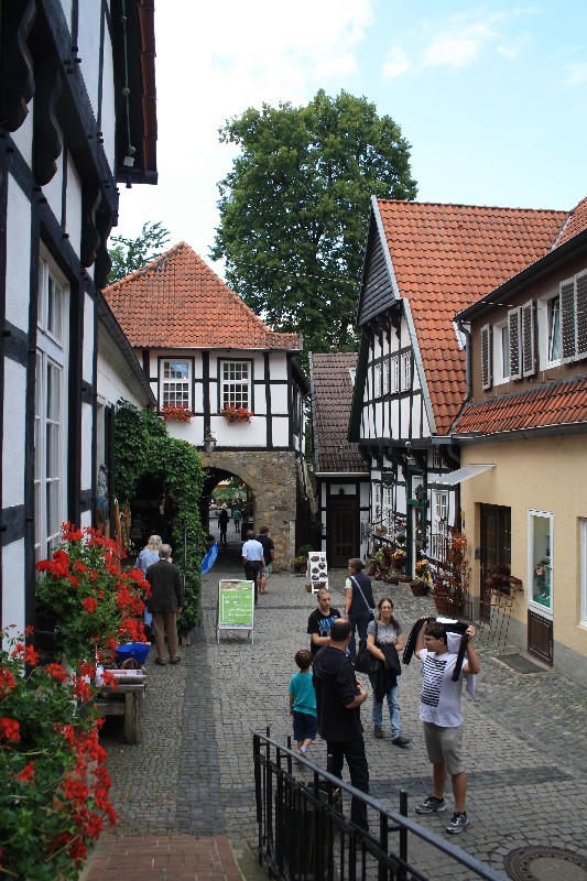 aber was man bedenken sollte ist der Besucheransturm der Freilichtbühne. Wir kamen am Samstag nachmittag noch rechtzeitig an um einen Platz zu ergattern, einige weitere stellten sich auf dem Parkplatz dazu (hat sich auch keiner drum gekümmert). Nachdem wir eine kleine Wanderung auf dem Hexenweg (nicht zu empfehlen bei Nässe!!-sehr steil und rutschig) hinter uns gebracht hatten besuchten wir das Städtchen und waren von dem Trubel von den Socken. Überall in den Gassen und Plätzen liefen Leute umher und da erst um 20.00Uhr die Vorstellung begann war bis ca.19.30 Uhr fast jeder Tisch besetzt. Wir kamen um 21 Uhr wieder am Womo an und der Platz war rappelvoll. Zwei spät ankommende Womos mussten den Platz wieder verlassen. Für Wanderfreunde und Radfahrer ein guter Ausgangspunkt für Etappen auf dem Hermannsweg / Hermannshöhen : --> Link hinter den Mauern der Burg finden die Festspiele statt