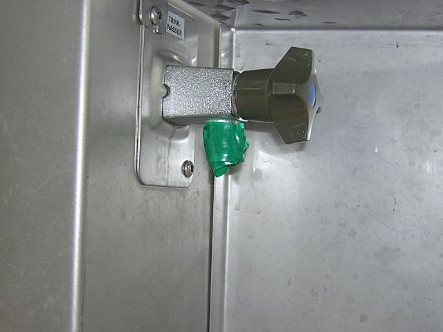 Extra Wasser zur Kassettenspülung gibt es nicht mehr. Mit Spendenstein. Man kann vorne auch kein Abwasser mehr entsorgen, der Bodeneinlass ist mit Blech geschlossen. Also hier gibt es jetzt eine Holliday-Clean-Anlage, Wasser 50 Cent, Wasser zur Kassettenspülung ist vorhanden.