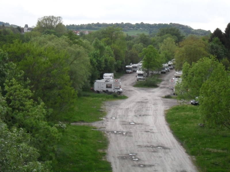 Der Platz ist staubig mit wenig grün, aber auch wenig Schlaglöcher. Stromsäulen gibts nur auf einer Seite des länglichen Platzes, für die andere Seite am Wasser braucht man recht lange Verlängerungen. Wer Sat-Empfang will, muß auf etwa ein Drittel der ca. 50 Plätze verzichten, da Bäume stören. Da stand ein Niesmann Clou-Liner, schwer zu sagen, ob der länger als 7,5m war. Der Kontrolleur vom Touristikbüro hat jedenfalls nur ein zu kurzes Fahrzeug angemeckert, nämlich ein PKW, das den Platz verlassen mußte. Tagesticket wie gehabt 3€, allerdings ist VE nicht am Platz, sondern am Festplatz, der, wie schon berichtet, nicht mehr direkt unter der Brücke erreichbar ist, sondern umständlich über die Brücke, wo man nicht direkt links von der Brücke abbiegen kann, sondern über die Brücke und dann irgendwie drehen muß. Nach der Einfahrt auf den Festplatz ist hinten links in einer Ecke ein kleines Häuschen mit Behinderten-WC und einer Toiletten-Entsorgung mit vorhandenem Spülschlauch. Vor dem Häuschen gibt es einen Wasseranschluß mit Drücker, der ungefähr 10s Wasser hergibt. Abwasser läßt man in einen der beiden Gullys laufen. Es ist alles kostenlos und in ordentlichen Zustand. Es war kein Fest im Gange, deswegen können wir über die Lautstärke nichts sagen, ausser vielleicht ein paar gackernde Weiblichkeiten die meinten, kurz nach halb 7 die Mitbewohner auf dem Platz an ihrem Freiluft-Frühstück teilhaben zu müßen ;-) 2-300 Meter weiter vor dem Volksfestplatz sind etliche geteerte Parkplätze, da kann man in einem solche Fall auch mal Übernachten. Wir standen über Pfingsten auf dem Stellplatz.