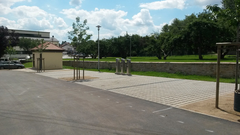 Ein ziemlich großer Parkplatz im Ort in ruhiger Lage für Autos und LKW. In einer hinteren Ecke ist eine kostenlose Entsorgungsstation für Chemieklo und Abwasser (mit Schlauch). Frischwasser gibts gegen Münze. Eine Stromsäule mit Münzeinwurf habe ich gesehen. In Sichtweite gibts einen Lidl-Markt. Wir waren vor etwa 2 Wochen eine Nacht auf diesem Stellplatz.