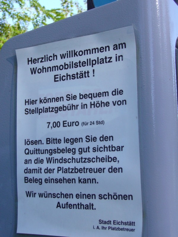 85072 Eichstätt im Altmühltal kostenpfl. Stellplatz an der Schottenwiese 6,00€ inkl. Dusche und WC 2,00€ 220 V Sehr schöner Stellplatz für ca 70-80 Wohnmobile am Festplatz Schottenwiese in Eichstätt. Für 6,00 € bekommt man einen Stellplatz bei dem sich eine Toilette befindet mit Dusche. V/E am Platzeingang für 1,00 €. Wenn man noch mal 2,00€ drauflegen will bekommt man sogar 220V. Prima Ausgangspunkt zum Fahrrad- und Kanufahren. Kurze Entfernung zum Einkaufen ca. 100m Supermarkt und nur ca 1km zum Ortszentrum ruhiger Stellplatz direkt an der Altmühl