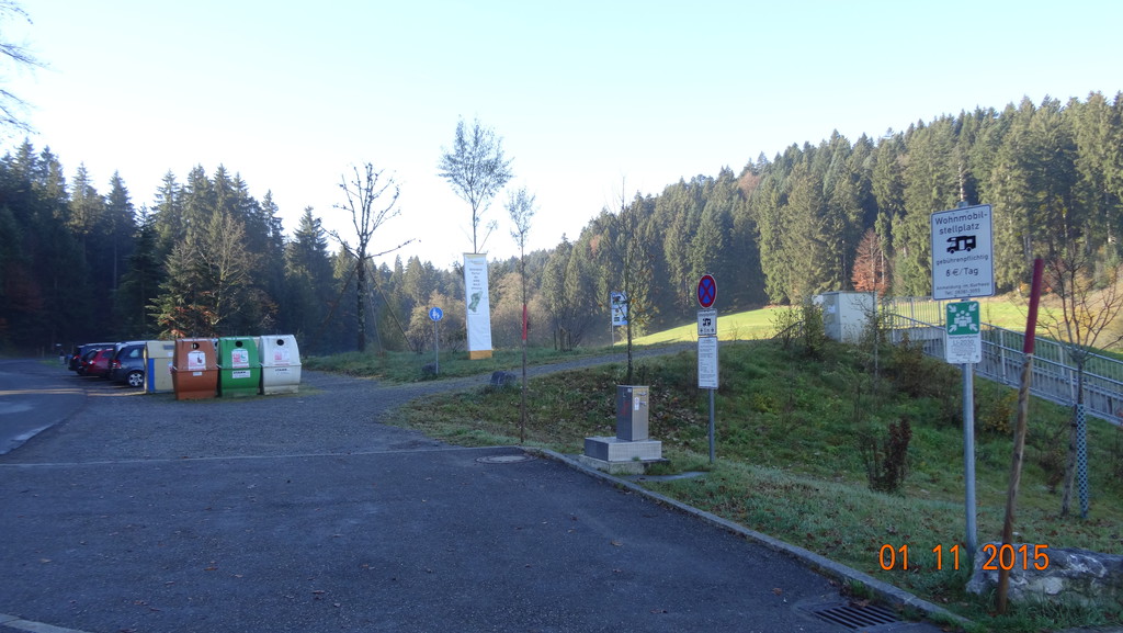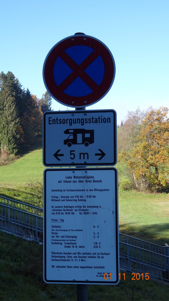 Die im Hintergrund sichtbare Kette trennt im Winter einen Teil der "alten" Stellplätze ab, damit mehr Parkplätze für Wintersportbesucher da sind. Im Frühjahr stehen dann auch wieder alle alten Stellplätze zur Verfügung. Die V/E wurde mittlerweile vom Kurhaus an die (neue) Stellplatzeinfahrt verlegt.