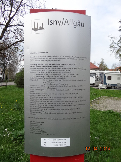 88316 Isny i.A. am Kurhaus Stellplatz 5 kostenlose Stellplätze reserviert für Wohnmobile direkt an der alten Stadtmauer und am Stadtpark. Die Stellplätze sind ab Ortsmitte ausgeschildert. V&E Station vorhanden, Wasser für 1,00 €, Stromsäulen vorhanden 0,50 € pro KW Hallo,