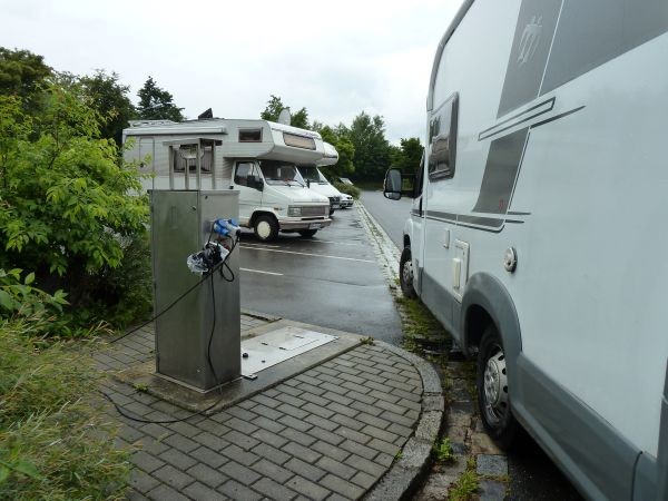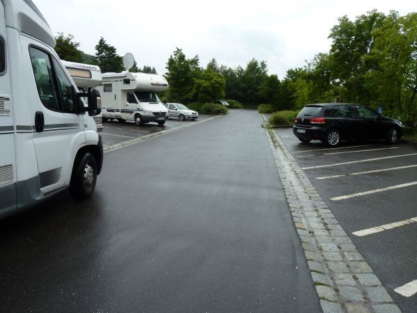 Parkplatz mit ausgewiesenen Womo-Plätzen in der Mitte.