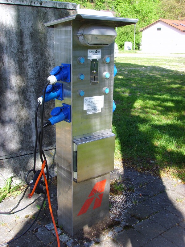 Warum die Stadt speziell angefertigte Stromsäulen bauen liess verstehe ich allerdings nicht. Es gibt auf dem Markt sicher ausgereiftere Konstruktionen "von der Stange". Es fehlt (mir?) z.B. eine Anzeige für den Verbrauch oder Restguthaben. Einwurf 1 Euro und das richtige Knöpfchen zur entsprechenden Steckdose drücken, dann gibt es für 8 Stunden Strom. Laut Aufschrift können auch 2 Münzen eingeworfen werden, dann aber auch nur 1 x drücken !! Man muss also die Säule "im Blick haben", damit das Licht nicht unerwartet ausgeht. Alles in allem : keine wirklichen Probleme. ![]() klugsch....odus an - die stromsäulen sind keine extraanfertigung sondern aus dem programm von arzt präzisionsmechanik, die bauen auch v+e-säulen...-klugsc....dus aus!