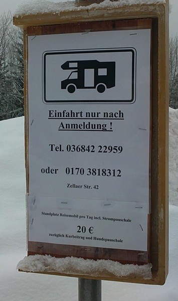 Reservierung geht nicht . Vorbeikommen und wenn der Platz voll ist ( Pkw ) warten bis wieder was frei wird . Ausgelastet soll nur um die Weihnachtszeit sein. Platz mit Wasser und Entsorgung 9.-€ Strom ohne Heizung 2.-€ pauschal wenns geht auf der rechten Seite stehen (Satempfang sonst 12 X Dvbt) Gasflasche 11 Kg 19.-€ Brötchen 5 Miuten Supermarkt 10 Minuten Fußweg Erpel Hallo, alles was bisher geschrieben wurde, könnt ihr nun vergessen. Heute stand in der hiesigen Presse(Freies Wort), es gibt einen neuen Pächter, der als erstes einmal die Preise erhöht hat. Wie hoch ,wurde nicht geschrieben. Strom soll es wohl noch geben ,aber V&E ist nicht mehr möglich. Biathlon-Fans sollten das einkalkulieren. Ich persönlich halte von diesem Platz nix, der schadet dem ohnehin nicht mehr besonders attraktiven Wintersportort Oberhof noch mehr. Statt einen kommunalen Stellplatz an der nun wieder in der Sanierung befindlichen Therme zu schaffen-Auf die 100 Riesen kommt es bei den ausufernden Baukosten auch nicht mehr an-denn die spielen sich mit Sicherheit wieder ein, werden die Ganzjahresgäste(Wohnmobilisten) an den Ortsrand gedrängt und dem Wohl und Wehe eines Parkplatzbetreibers ausgeliefert. Aber es wird ja immer welche geben, die damit zufrieden sind. Wie ernst das Thema von den Verantwortlichen genommen wird, erkennt man ja daran, das keinerlei konkrete Angaben gemacht werden. Schade, das haben die Sportler nicht verdient, die Oberhof überhaupt erst zu dem internationalen Ansehen verhalfen, dass nun immer mehr leichtfertig verspielt wird. Albert Wir sind gerade da, sehr freundlich empfangen worden. 10 Euro, Kurtaxe 3 Euro, Kids 1 Euro und Strom 3 Euro. Sind für uns 20 Euro. Mit der Kurtaxe ist auch der Bus bezahlt. V+E funktioniert! Also alles ganz locker. Ist halt ein Wintersportort und während der Weltcups entsprechend viel los. Engis wir waren bis gestern auch auf dem Stellplatz an der Zellarstrasse. Uns hat man 12€ für den Stellplatz, + 2€ für den Hund,+ 3 Eurofür Strom,+ 4€ Kurtaxe = 21 Euro abgeknöpft. Die Situation hat sich nicht geändert gegenüber dem Vorbeziter Winkler. Der Neue Stellplatzbetreiber heißt Schmiechen, er betreibt aucg den Rodellift und die Pension neben dem Stellpatz, er war übrigens sehr unfreundlich. Als Alternative kann ich diesen Platz empfehlen: --> Link Hallo zusammen, es gibt jetzt eine Kette am bisherigen Eingang mit der Bitte, eine Tel.-Nr. anzurufen. Außerdem hat sich wohl der Preis geändert: 20 Euros + Kurbeitrag + Hunde aber einschließlich Strom :-( ![]() für solch einen primitiven Stellplatz? Nee, es gibt noch Alternativen. Jedensfalls machen wir diese Abzocke nicht mit.