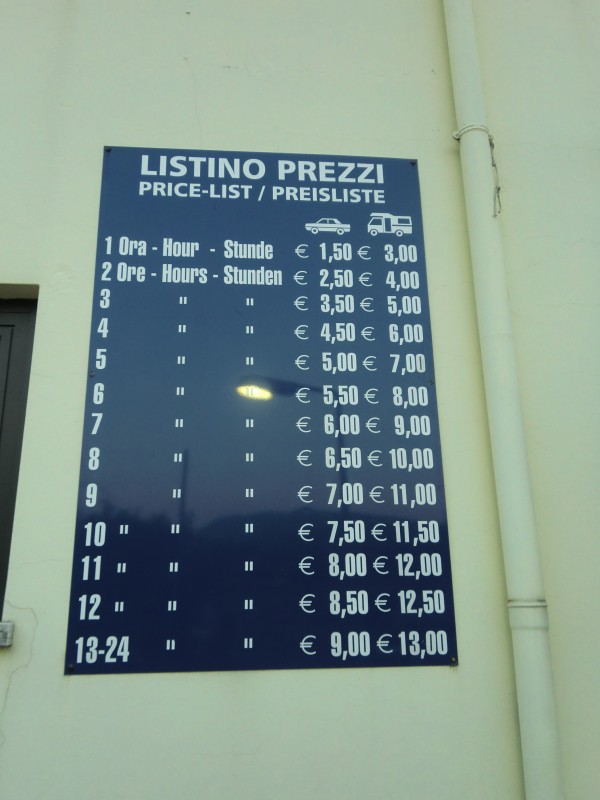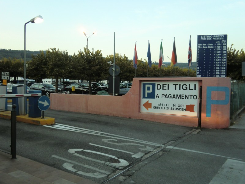 September 2011 "normaler" Parkplatz mit ausgewiesenem Bereich für Womo`s. 2 Minuten bis zur "Innenstadt" Nachts ziemlich ruhig - wenn denn die ganzen italienischen Bambini mal im Bett sind gestaffelte Preise, 13 - 24 Std. = 13 €