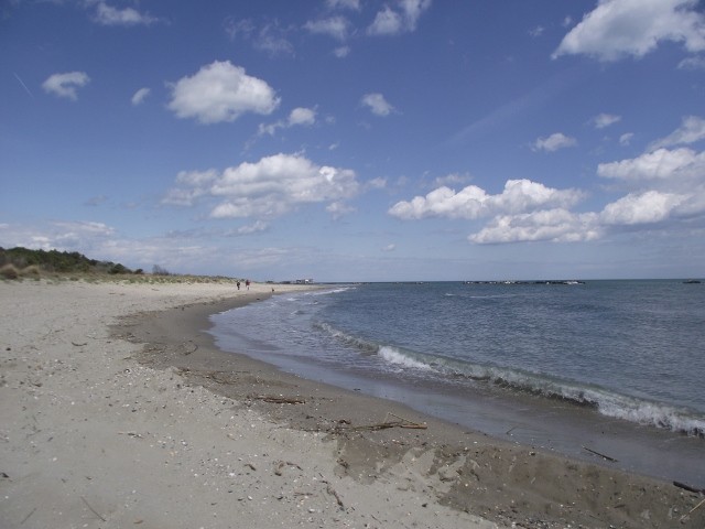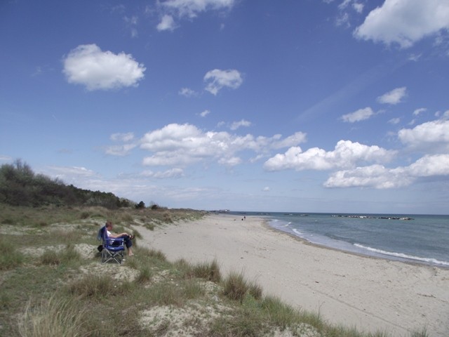 Der Platz verfügt über zwei offene Duschen, die von den Italienern auch gut frequentiert sind. Man duscht eben in Badesachen. Acuh sind mehrere Spülbecken für den Abwasch vorhanden und eine offene Feuerstelle zum Grillen. Es empfiehlt sich auf diesem Platz antizyklisch zu den Italienern zu leben. Morgens, wenn die ganzen italienischen Papas schonmal mit sämtlichem Strandgeraffel gen jenen ziehen um sich ein gutes Plätzchen möglichst nah am Strandzugang zu sichern kann man mal vorsichtig aus dem Fenster schauen, sich umdrehen und noch ein Stündchen schlafen. Wenn der Italiener dann frühstückt, gehts zum Bäcker, denn dann ist dort die Rushhour vorbei. Wenn man es sich dann beim Frühstück gemütlich macht wird es bald sehr ruhig auf dem Platz, da alle am Strand sind. Nach einem ausgedehnten Frühstück sieht man dann so gegen Mittag die ersten Italiener vom Strand zurückkommen. Das ist der Augenblick selber zum Strand zu gehen. Nun wird nämlich der SP wieder voll und von mittäglichem Trubel erfüllt. Dafür ist am Strand jetzt wenig los. Gegen drei füllt sich dieser dann wieder mit den vom ausgiebigen Mittagessen zurückkehrenden Italienern. So, noch ein Stündchen und dann reicht es uns mit Strandleben. Schön ruhig der Platz, nix los an den Duschen, wunderbar. Und wenn dann die Kohorten vom Strand zurückkommen, schauen wir uns die Völkerwanderung gemütlich mit einem Vino in der Hand an. (Mit einem Augenzwinkern zu betrachten - wir leiben es) Außerdem gibt es einen zweiten Minisupermarkt, im Neubaugebiet gegenüber der Marina am großen Platz einen Frutta e Verdura wo man sich durchaus genießbare Weine abzapfen lassen kann und auch ein paar durchaus annehmbare Restaurationen und einen Metzger. Oder man hatten einen freundlichen italienischen SP-Nachbarn, der einem eine Art Federweißen von seinem Nachbarn von zu Hause aus dessen Faß anbietet - in großen Gebinden ... Einmal im Jahr ist dort eine Festivität mit wirklich beeindruckendem Feuerwerk dass man herrlich vom Strand aus in einer Strandliege genießen kann. Außerdem viele Kinder, Hunde und Leben. Uns hat es sehr gut gefallen und wir haben uns pudelwohl gefühlt. Und wer nur ein wenig kommunikativ ist hat sofort Familienanschluss.