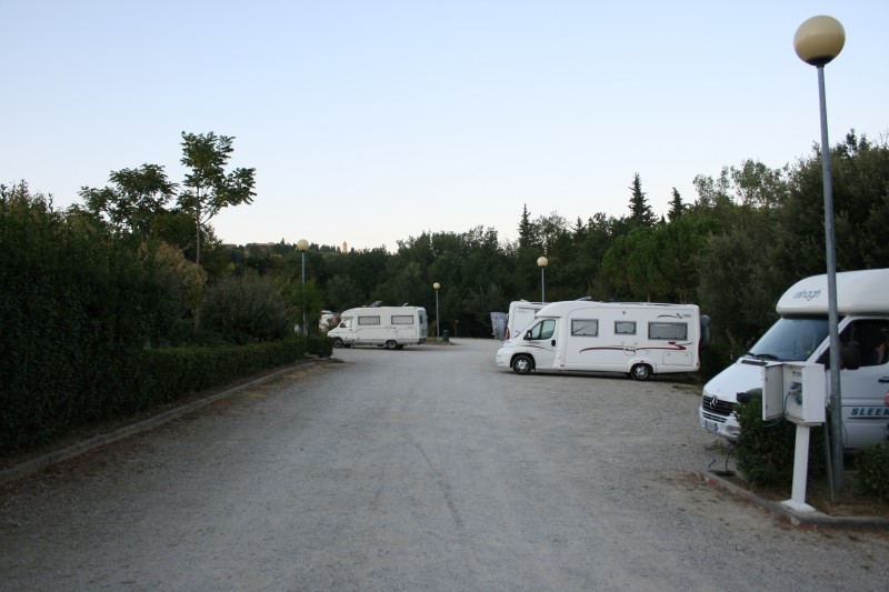 Untergrund Schotter - leicht schräg. Stellplätze rund um einen Fußballplatz. Im Gebäude Weinverkauf und Restaurant. Wir wurden vor San Gimignano vom Kreisverkehr an durch einen Motorrollerfahrer auf den Stellplatz gelotst. Leute sehr freundlich. Kostenfreier Bustransfer nach San Gimignano. Preis 22 EUR inkl. Strom Ver- und Entsorgung am Platz 8)