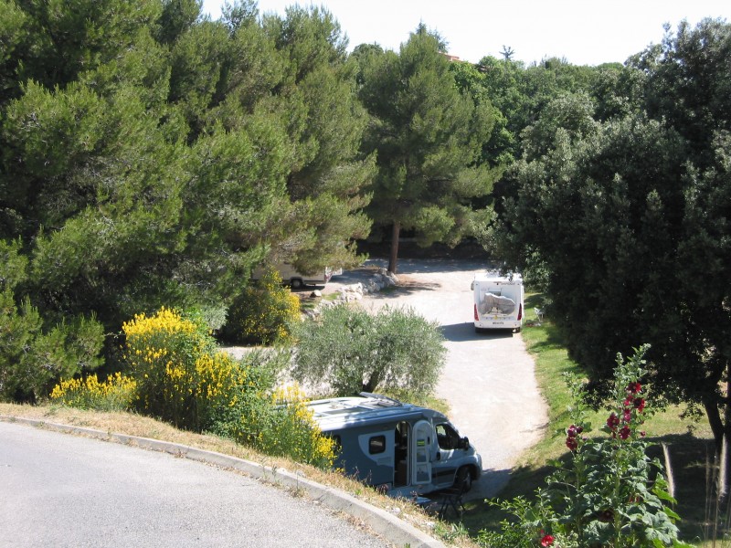 Leider schon voll, als wir ankamen. So haben wir uns, wie andere auch, "eine Etage höher" auf die PP am Friedhof gestellt und gehofft, dass am nächsten Morgen keine Beerdigung ist. Man wird gut beschildert durch den Ort den Hang hoch gelotst; immer weiter und weiter und man denkt schon, gleich geht's wieder runter - und dann ist man da :wink: . Geht man auf 'Link zum Zielpunkt: Klick mich', dann erscheint der grüne Pfeil allerdings an der falschen Stelle. Der SP ist am Ende einer Sackgasse am Hang unterhalb des Friedhofs (kl. Stückchen südlich unterhalb des blauen Dachs oder Pools in der Karte). Von uns ermittelte Postion: Latitude, Longitude: 43.896087187442774, 5.86169958114624 Bäcker gleich bei den Häusern oberhalb der Straße. Blick von oben auf den SP (am nächsten Morgen):
