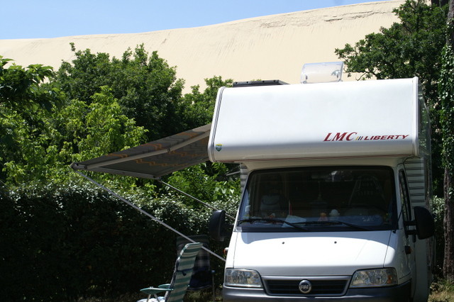 Man muss schon einen sehr großen Alkoven haben, wenn man nicht unter die Bäume passt. Nur Fernsehempfang ist dort schlecht. Und richtig ebene Plätze sind selten. Auch der Busparkplatz ist etwas schief... Anbei Bilder von der Düne