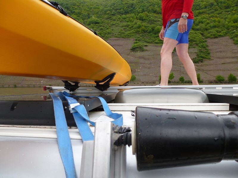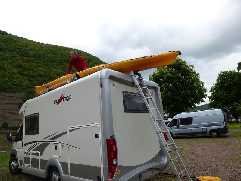 Die Kombination aus diesen beiden Aussagen führte bei uns zu zwei "Einer" Faltkajaks. Denn immer zwei Kajaks auf dem Dach mit zu führen, könnte nicht vorstellen. Denn es gab auch schon einige Urlaube, in denen wir sie nie hätten nutzen können. Andererseits haben sich auch Nutzungsmöglichkeiten ergeben, an die wir vorher nie gedacht hätten. In den Fällen ist man mit Faltern im Stauraum auf alle Eventualitäten vorbereitet. Festboote wären daher für uns keine Alternative. Aber das gilt nur für UNS und soll lediglich als Denkmodell aufgefasst werden. :wink: Roman Hallo zusammen, wir nehmen unser 2-er-Kajak nur dann mit, wenn wir es auch sicher nutzen (z.B. wenn wir einen Fluss weiterabfahren mit Wohnmobil, Fahrrad und Kajak). Im Winter nehmen wir nur Langlaufski mit - kein Kajak ;-) Unser Mobil ist 2,85 m hoch - mit 2-er-Kajak (37 kg) auf einem Dachträger mit Thule Boothalterung ca. 3,35 m. Wir hatten erst einmal das Problem, dass wir vor einem Tunnel in der Schweiz standen und viele Km zurückmussten (der Tunnel war zu lang und unbeleuchtet :-( um das Boot abzuladen und durch den Tunnel zu schieben und unser Navi war auf PKW gestellt). Sonst reicht es häufig, sich weit in der Mitte zu halten - geht natürlich nur, wenn wenig Verkehr ist. Ach ja, auf dem Dach habe ich Alu-Riffelblechstreifen geklebt. Ist weniger rutschig und schont die Dachhaut. Bisher habe ich keine Schäden entdeckt. Die Leiter ist eine aus 2 Teilen bestehende - zusammengeschoben ca. 1,80m lang - und bleibt immer in der Fahrradgarage. Viele Achim habe ich jetzt die Kanutenseelen aus dem Winterschlaf geweckt? Danke für eure Anregungen, haben mir sehr geholfen! Ich werde jetzt mal alles ruhig überlegen und dann ... sieht so aus als ob bald 1,2 Kajaks den Sunny bereichern werden :mrgreen: