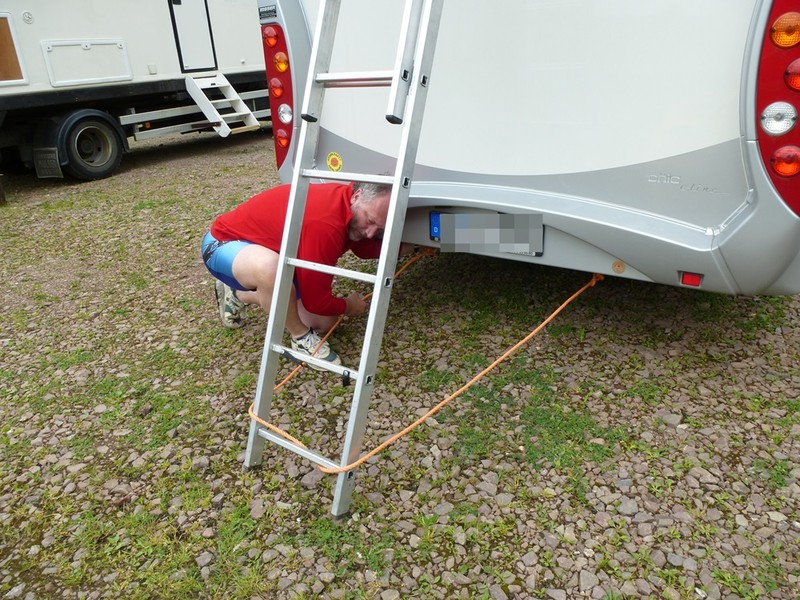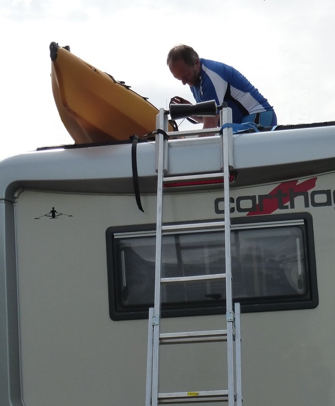Wie schon oben beschrieben, habe ich an den Querträgern werksseitig Stützen dran. Das mit den Rollen habe ich auch schon vorbereitet. Ich habe die gleiche Idee wie Du gehabt. Ich habe mir zwei Kielrollen für Motorboothänger im Yachthandel gekauft. Die sind fast so breit wie meine Leiter. Die Rollen will ich im oberen Bereich der Leiter, dort wo sie aufs Dach führt anbringen. Supervielen Dank für Deine Hilfe und aus dem (frostigen) Norden Ingo :D :D :D Mich würden die Rollen an der Leiter interessieren. Gibt es davon Bilder?? Antoine Hallo, da es dieses Thema immer wieder mal gibt, habe ich bei einer der Touren ein paar Fotos machen lassen. ![]() Zuerst befestige ich unten die Leiter immer, damit sie nicht wegrutscht (wenn oben auf der Rolle der Leiter das Kajak liegt... ![]() Dann ziehe ich mit einem Seil das 2er Kajak hoch - unten hält meine Frau das Kajak erst zurück, um das WoMo nicht zu rammen - und dann schiebt sie mit... ![]() Hier ist das Kajak schon oben, man kann die Leiterbefestigung erahnen. ![]() Hier sieht man die halbe Rolle und die Leiterbefestigung, die auf beiden Seiten von unterhalb der obersten Sprosse zu den WoMoSeiten gehen, sonst rutscht die Leiter bei hochziehen seitlich... ![]() hier noch einmal die Leiter nach der Aktion... Ach ja: Kosten - Leiter (Baumarkt:70 Euro, Rolle:15 Euro, Seil (Befestigung unten):Rest von langem Seil, 2 Gurte (Befestigung oben):benötigt man sowieso, + Träger) Wenn noch Fragen da sind ..... hier. Achim Hallo, mich beschäftigt auch gerade das Thema Kajak am Womo und da interessieren mich besonders Erfahrungswerte von Personen, die schon länger mit Kajak reisen. Ausgangslage: Sunlight T59 soll mit Wander (1er) oder 2er Kajak am Dach beladen werden. Am Dach ist ausser Solar bis jetzt noch nix. Die bisherigen Beiträge, vor allem die Bilder, haben mir schon sehr geholfen, aber es bleiben für mich noch einige Fragen offen, ehe ich mich entschließe das Kajak zu kaufen: Haben sich bei euch öfter Probleme mit der der Höhe (gschätzt ca. 360 - 380cm, je nach Lagerungsart Ovalbügel oder Mulde) ergeben? Wo bzw. wie lagert ihr die Leiter für das Hochziehen? Wieviel Zeit müsst ihr für das Auf bzw. Abladen aufwenden? Gibt es Probleme beim Begehn das Daches? Reist ihr oft mit Kajak? etc., etc Wenn ihr Tipps habt, die mir bei meiner Entscheidungsfindung helfen, wäre ich dafür sehr dankbar Wir haben immer ein, zwei Kajaks auf dem Dach. Das Beladen dauert ca. 20 Minuten mit Verstauen und Verzurren. Im Kajak sind die Paddel, Westen usw. Die Höhe ist mit 3,60 noch nie ein Problem gewesen ( 3,40 mit einem Kajak liegend, zwei Kajaks transportieren wir stehend). Einmal wollten wir die Kajaks abnehmen und durchtragen, aber der mit 3,10 ausgewiesene Tunnel war dann doch hoch genug (in der Mitte) Wir nutzen eine Schiebeleiter, die ansonsten im Unterboden liegt. Ohne Kajak geht gar nicht. Das wär dann kein Urlaub :-) Da ich Zölzerschienen aufgeklebt habe, laufe ich auf dem Dach entweder auf diesen oder auf meinen Solarpanels. Bislang kein Dachprobleme. Alles weitere und auch Bilder: --> Link Jürgen ![]() Hallo Engis, danke für die schnelle Antwort das hast du super dokumentiert!!!