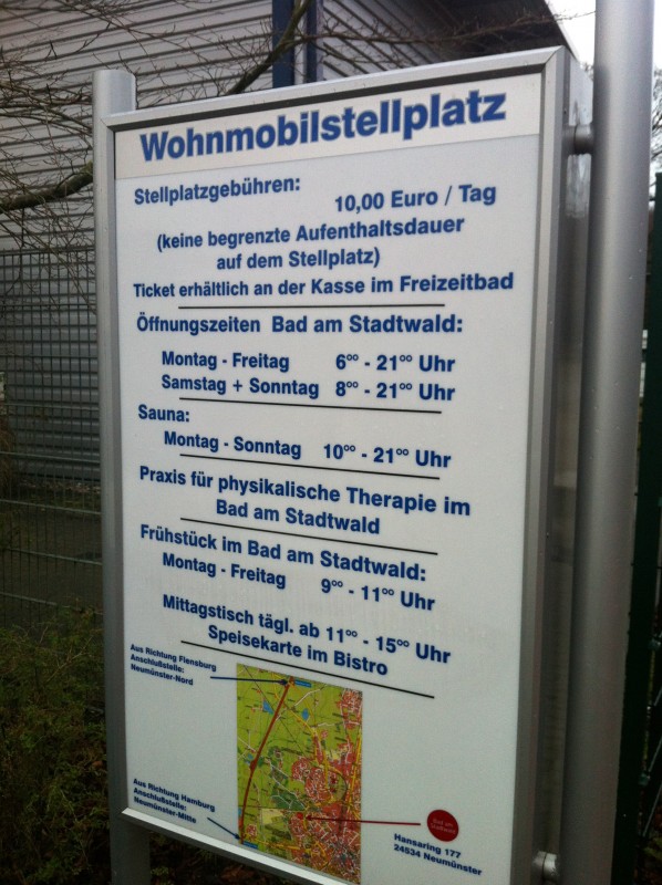 Hier der Auszug aus unserem Reisetagebuch: Wohnmobilstellplatz am Schwimmbad der Stadt Neumünster Hansaring 177 (Am Stadtwald / Schwimmbad) D-24534 Neumünster GPS- Koordinaten: N 54.08180° / E 09.96084° Übernachtet: ja! Übernachtungskosten: 6,- € + 1,50 € für Strom Kurzbewertung: Großer Platz (mindestens für 15 Mobile) mit vielen Parzellen und sogar ein wenig Platz innerhalb der eigenen Parzelle vor dem Wohnmobil, um auch mal einen Stuhl nach draußen stellen zu können. Es gibt ferner einige Picknickbänke und sogar eine große Grillstelle findet sich hier auf dem Stellplatzareal. Strom gibt es aus den Versorgungskästen (CEE- Stecker erforderlich), für 50 cent erhält man 1000 Wh. Der Platz ist im hinteren Bereich des Schwimmbadparkplatzes abgegrenzt und mit einer Schranke versehen, die man aber selber auf- und zumachen kann. Durchgangsverkehr findet somit nicht statt. Gleich rechts von der Einfahrt befindet sich eine Sani- Station, Grauwasser kann zusätzlich kostenlos in den Bodeneinlass abgegeben werden. Im Schwimmbad können Gäste des Stellplatzes vergünstigt duschen, allerdings ist das Schwimmbad mit Außen- und Innenbereich so toll, dass wir auf jeden Fall einen Schwimmbadbesuch empfehlen. Im Schwimmbad gibt es auch einen Imbiss, der morgens Frühstück serviert oder auch mittags / abends einfache Gerichte zu annehmbaren Preisen zubereitet. In die Innenstadt ist es etwas weiter weg (ca. 2-3 Kilometer), sodass sich nach unserer Ansicht der Einsatz des eigenen Fahrrades auf jeden Fall lohnt. Wer kein Fahrrad hat, kann alternativ im Schwimmbad ein Leihfahrrad mieten. Nachts ist der Platz gut beleuchtet, die Einfahrt gleicht dann ein wenig einer Landebahn wie au einem Flughafen ;-) Wir haben eine ruhige Nacht hier verbracht und können den Platz (und besonders das Schwimmbad!) uneingeschränkt empfehlen. Kommen gerade wieder nach Hause. Waren in Neumünster auf diesem SP.