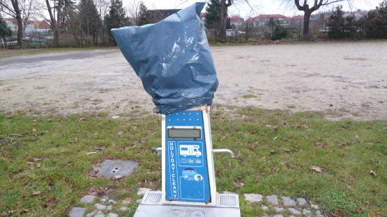 Kostet immer noch 10€, aber Strom ist abgestellt, alles tot. Entsorgung Säule offen, in Reparatur. Entsorgen kann man wohl, aber nicht spülen.