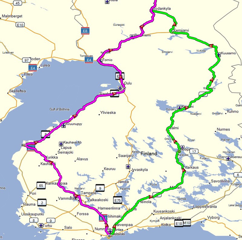Geplant ist es, die E75 hoch zu fahren (vorbei an Lathi, Jyväskylä, Richtung Oulu)