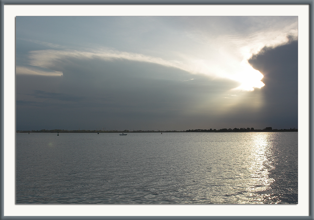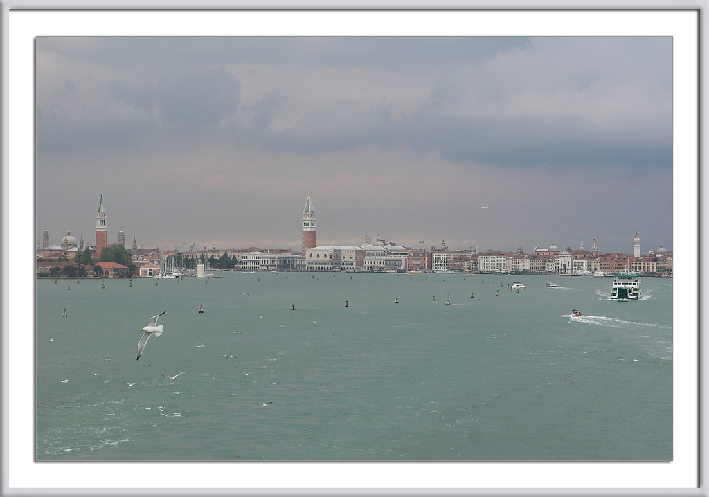 So langsam entfernte sich Venedig und mit zunehmender Entfernung schien der Bann auf viele der Schaulustigen nachzulassen, sie packten die Photoapparate wieder ein und wandten sich zum Gehen. Na gut, dachte ich, es wird etwas frisch, schau'n wir mal, was es auf dem Schiff so alles gibt. Ich habe mich ein letztes Mal umgedreht, und - Voilà! - ich kann es nur immer wiederholen: ungewöhnliches Licht ergibt ungewöhnliche Bilder.