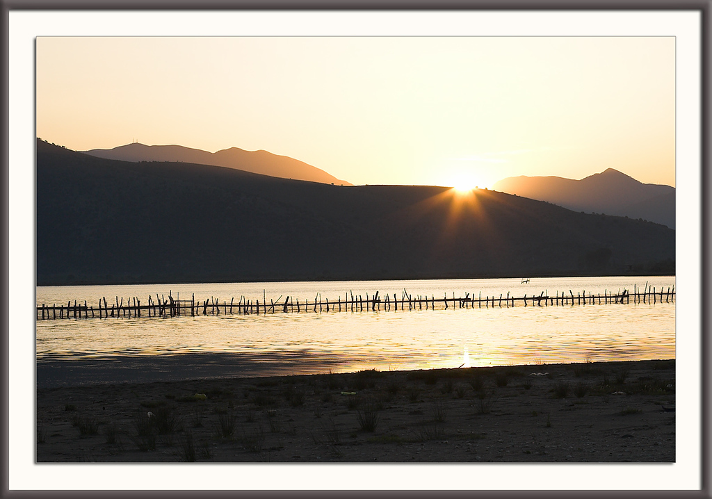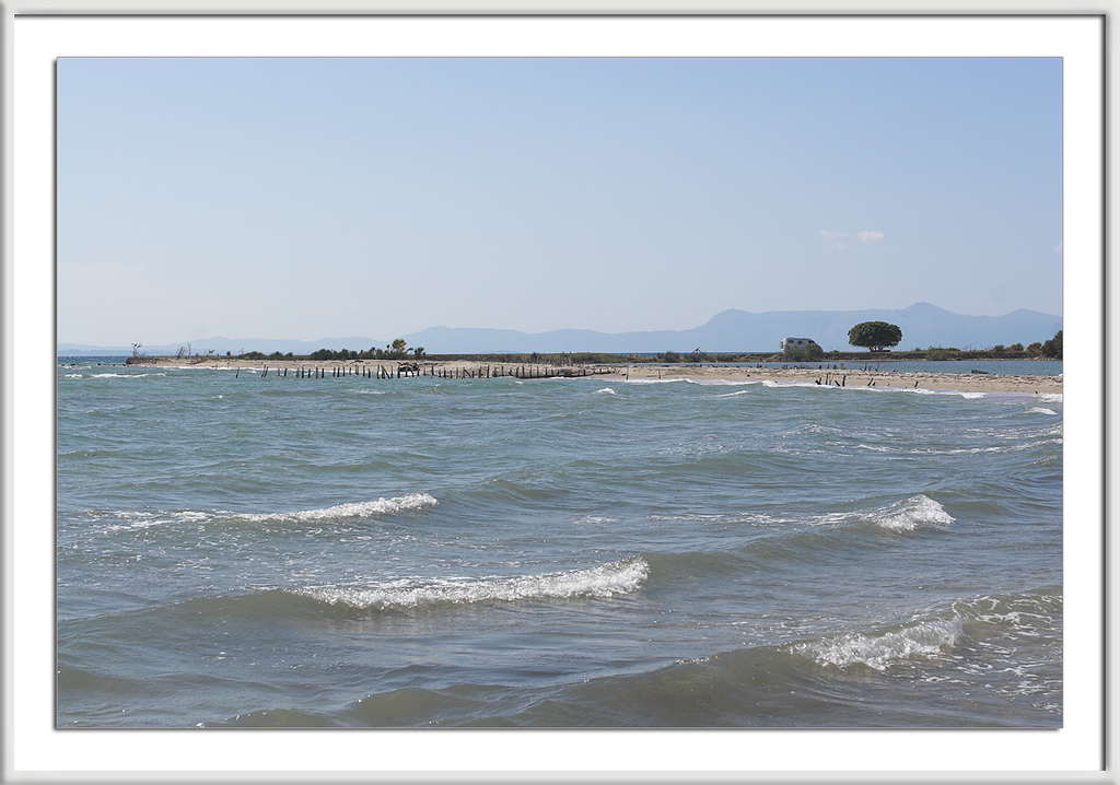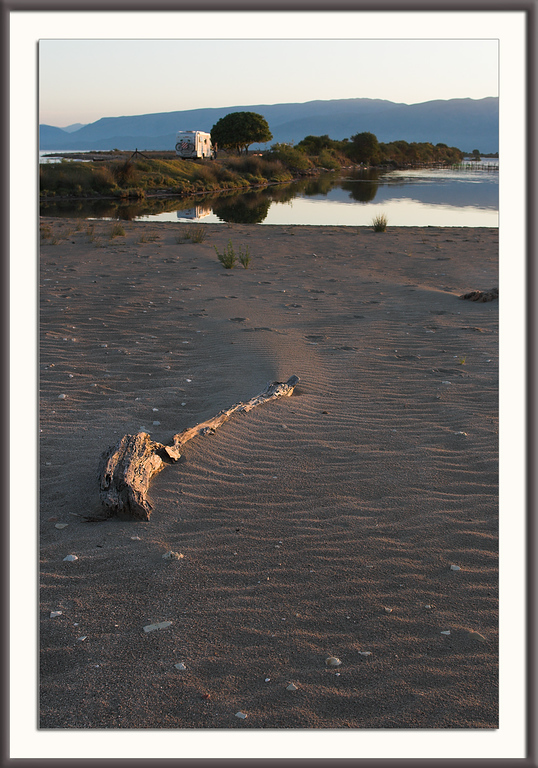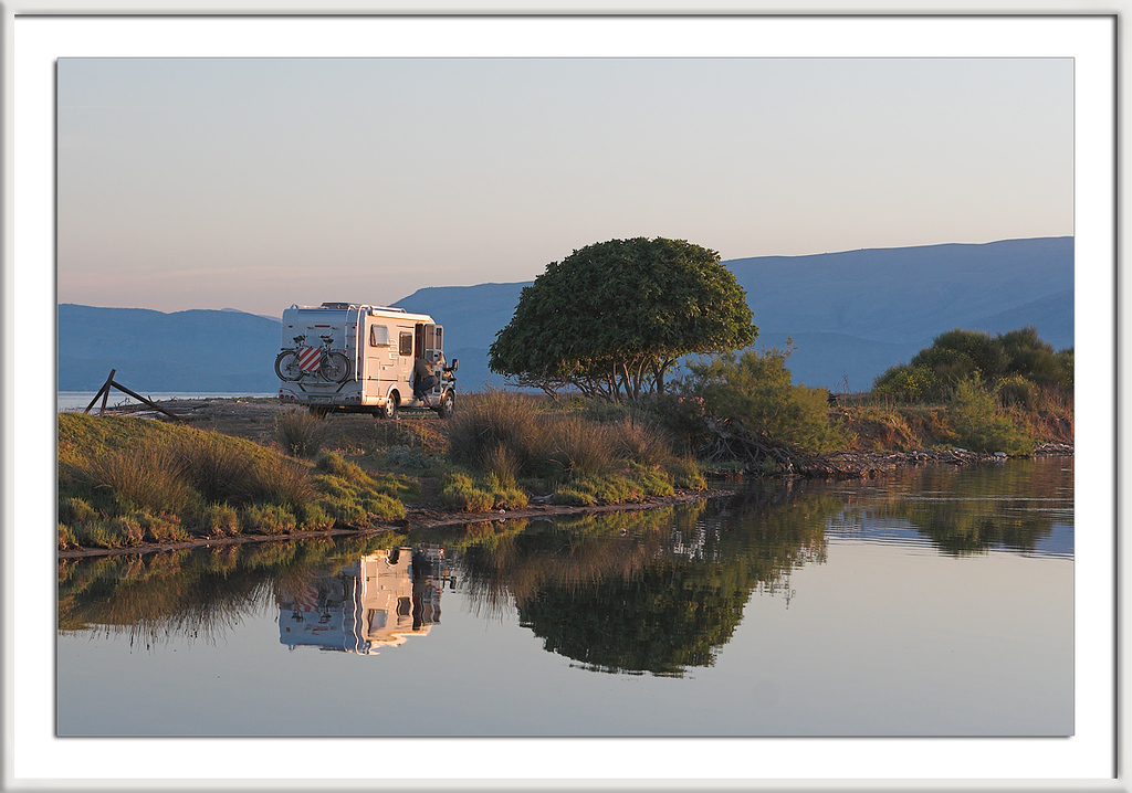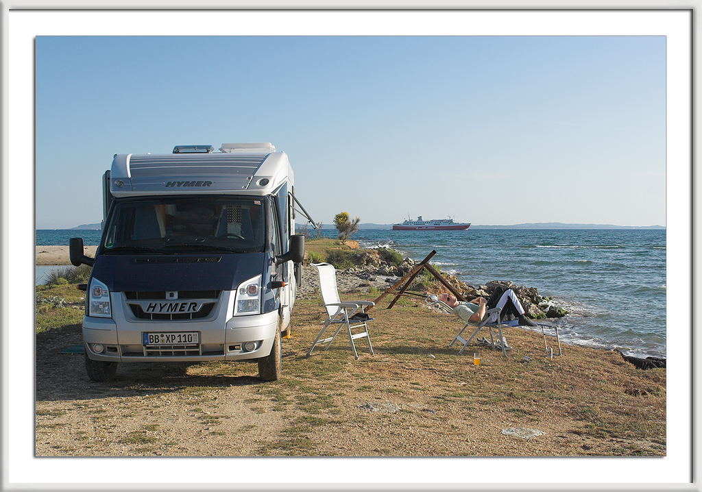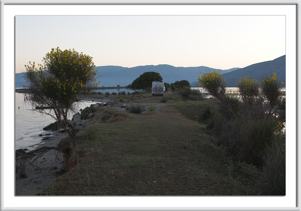 Der Blick nach Osten, mit den Absätzen stehe ich beinahe im Meer, zeigt unsere verschlafene kleine Hütte. Der Mann rechts neben dem Womo ist ein griechischer Rentner, der sehr gut deutsch sprach und die frühen Stunden zum Angeln nutzte, gefangen hatte er bisher aber nichts. Später bot ich ihm eine Tasse Kaffee an, die er dankend ablehnte, jedoch hat er sich sichtlich über das Angebot gefreut - es ist so einfach, miteinander auszukommen.
