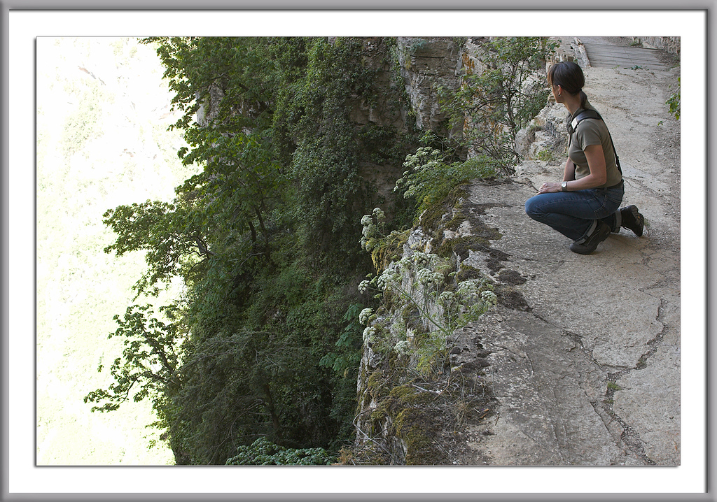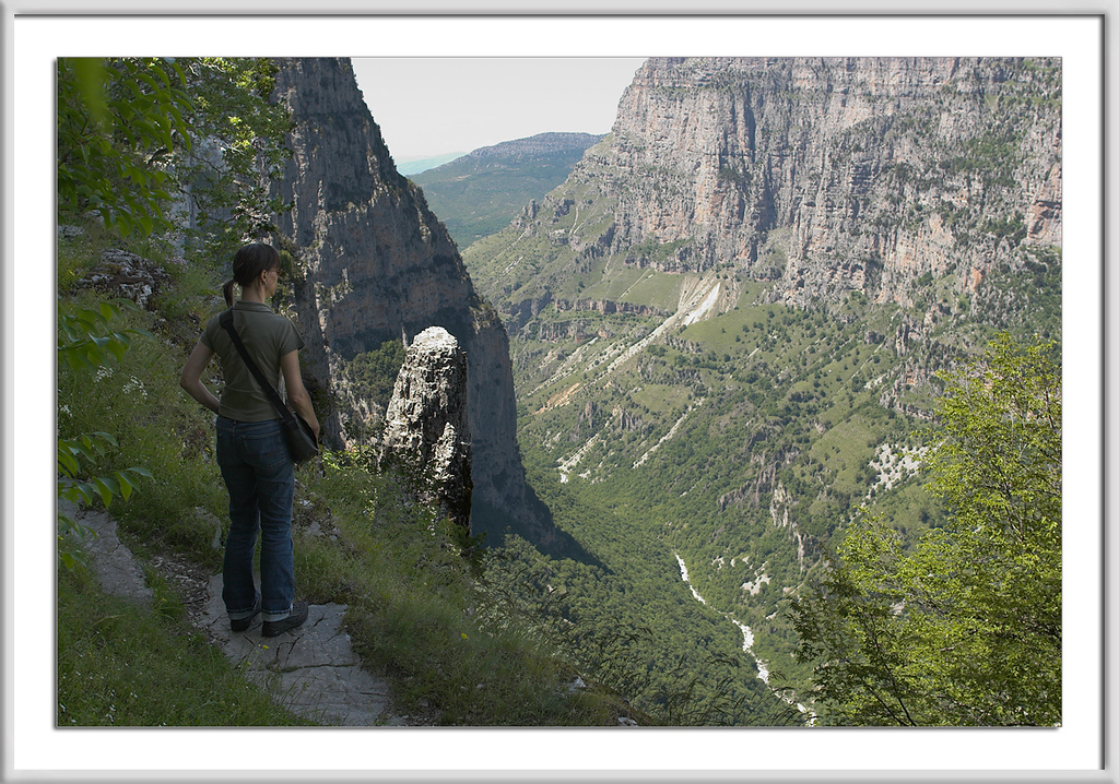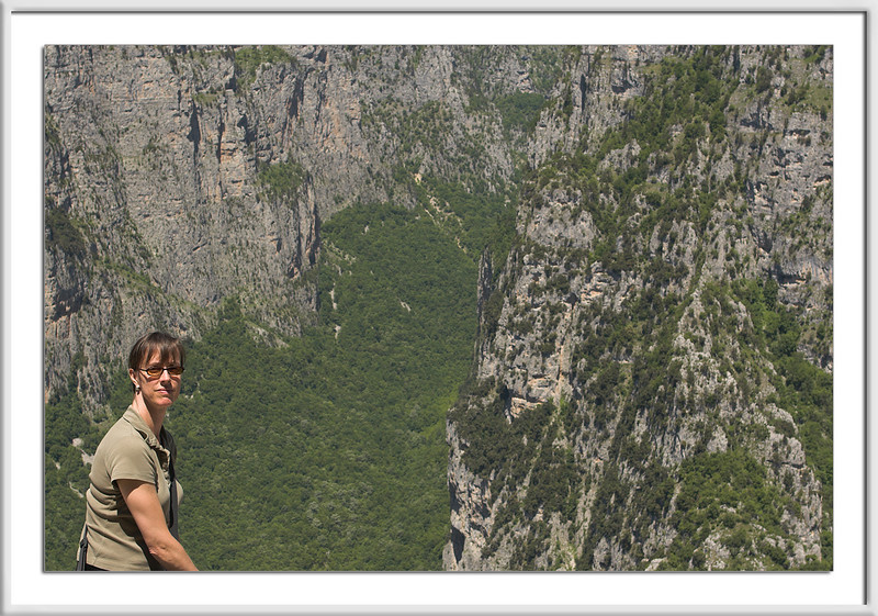 Von Monodentri führt die Straße weiter aufwärts, zum Rand der Vikosschlucht und endet an einem kurzen Fußweg, welcher zu einem Aussichtspunkt in die Schlucht führt (Vikos Balkon). Dieser Balkon war unser nächstes Ziel und - aber Hallo!! - dort sollen wir morgen runter? Und wieder hoch?? Na ja, so ist es, wenn man sich als Bär mit einer Wanderameise einläßt ...