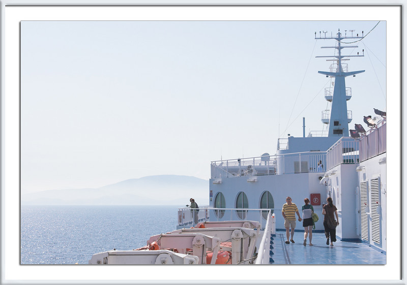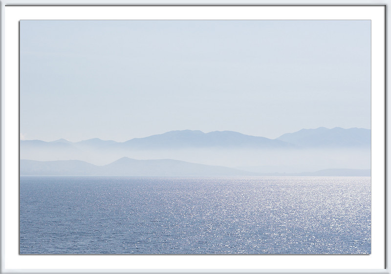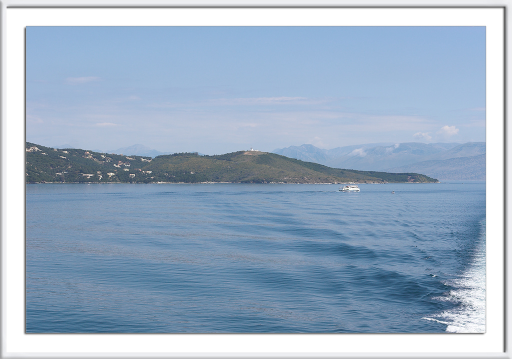 Der Vormittag verging unter dem erhofften blauen Himmel, während sich unser Dampfer durch die Enge zwischen der albanischen Küste und der Insel Korfu zwängte. Der leichte Dunst und das Gegenlicht verzauberten die albanische Küste in eine Abstufung von Hellblau.