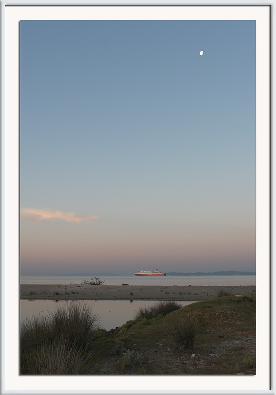 Die Fähren sind unermüdlich dabei, ihre erwartungsschwangeren Frachten von einem Hafen in den anderen zu bringen, und der Mond und ich schauten zu.