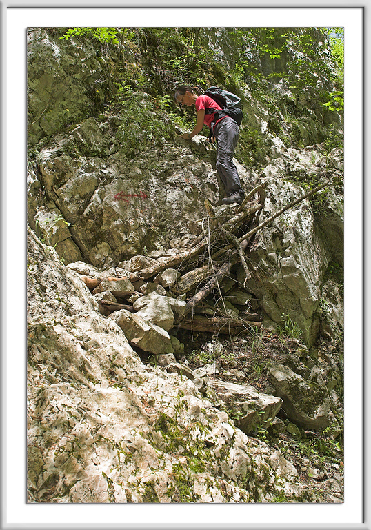 In die Schlucht hinunter sind wir von links in das Bild gelaufen und rechts unten ging's zur Talsohle. Die abenteuerliche "Brücke" und die rote Markierung hatten wir im Rücken und deshalb übersehen.