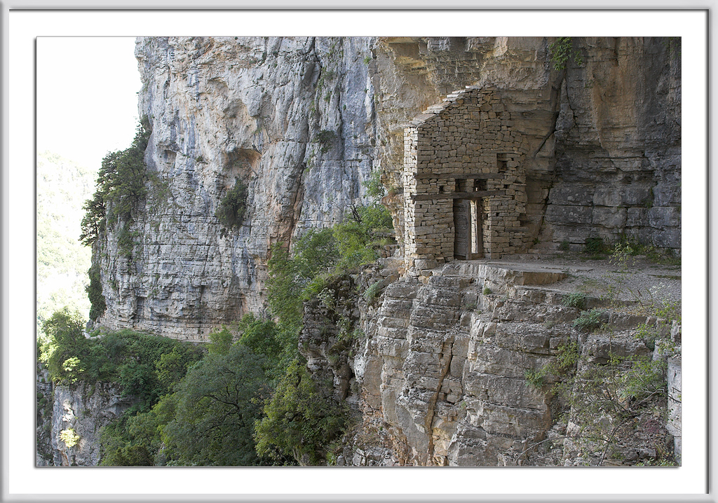 Der helle Streifen auf dem Grund der Schlucht ist das trockene Flußbett. Erst weiter flußabwärts (im Bild nach links) zeigt sich der junge Voidomatis als kleiner Bach.
