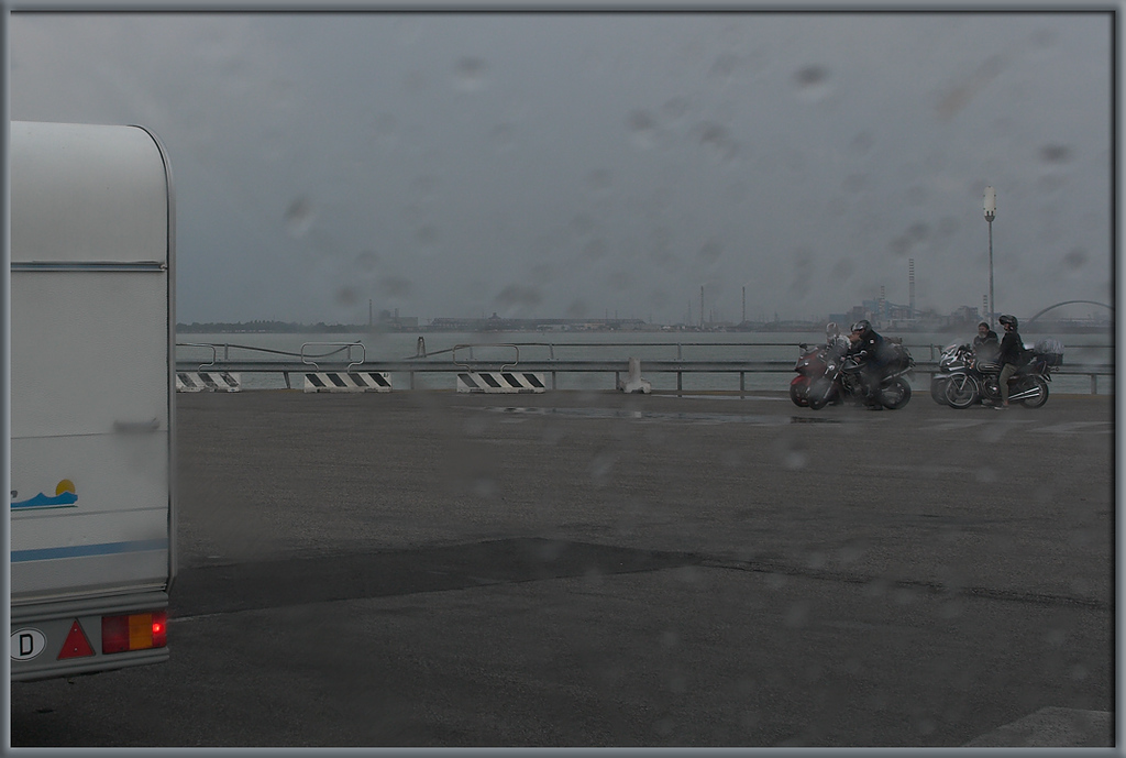 "Vergis bloß nicht ein Bild davon zu machen, wie ich die erste Rampe meines Womolebens meistere", erinnerte ich Waldameise, ihr Herz hing aber an den armen Motorradfahren, die in dem wieder einsetzenden Regen so verloren aussahen.