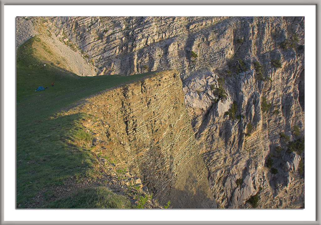 Nachdem die Sonne so tief stand, daß sie hinter Bergspitzen verborgen war, gefroren die Schatten wieder. Das war für uns das Signal ein treffliches Abendessen zu uns zu nehmen (belegte Brot, im Rucksack überbacken, Obst und verformte Schokoriegel), zum Trinken gab es das herrliche Quellwasser.