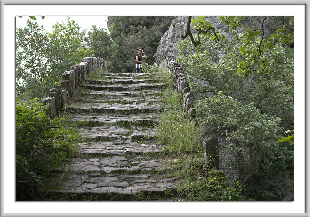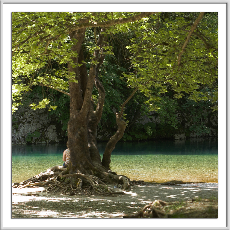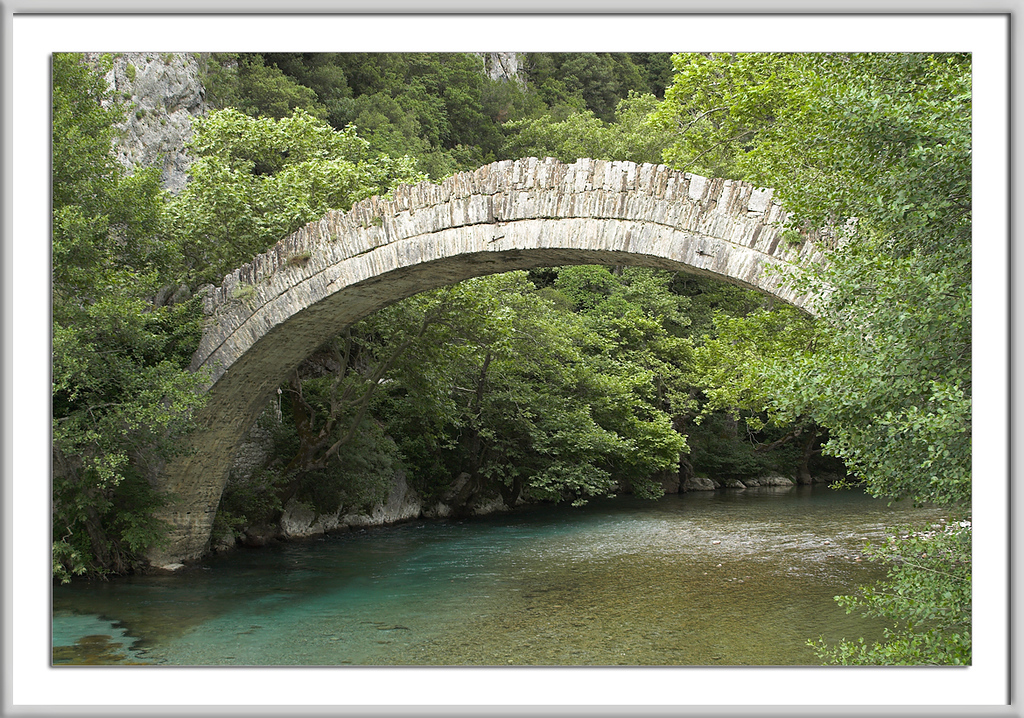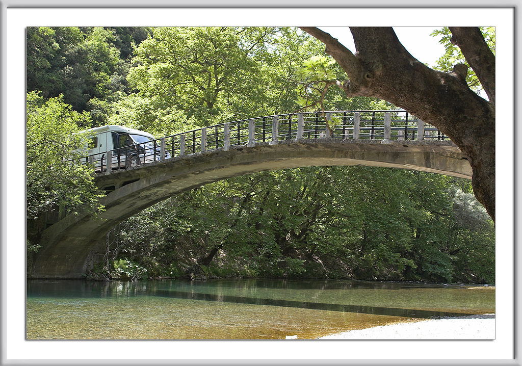 Die erste schöne Stelle welche zum Verweilen einlädt, ist ein schattiger Platz am Ufer eines alten Bekannten: dem Voidomatis. Nicht weit von der Stelle, an welcher der Voidomatis die Vikosschlucht verläßt, führt eine kleine Brücke über den Fluß, nach der Brücke (in Richtung Osten) beginnt der Pindos Nationalpark.