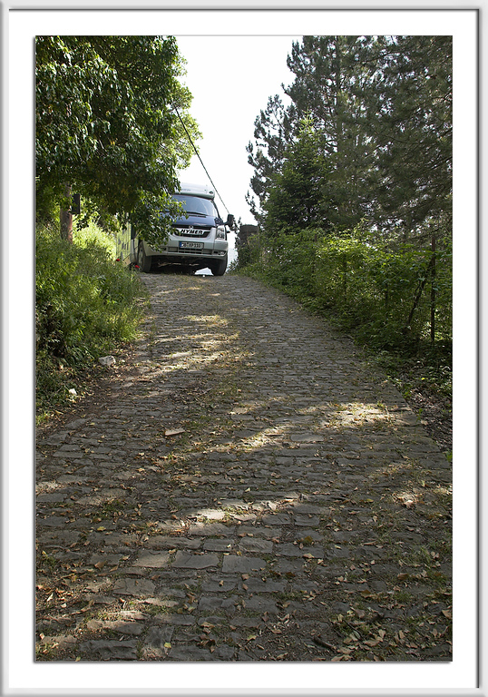 Im Ort angekommen gab's lange Gesichter, der Platz war belegt, und auch jeder weniger gerade war es. Aber Waldameise hatte bei der Auffahrt ein Parkplatzschild gesehen. Nach einem wackeligen Wendemanöver auf dem schrägen Kirchplatz fuhren wir 100m zurück. Tatsächlich, im spitzen Winkel führt eine Straße, genauer gesagt ein Weg, steil nach rechts-hinten-unten.