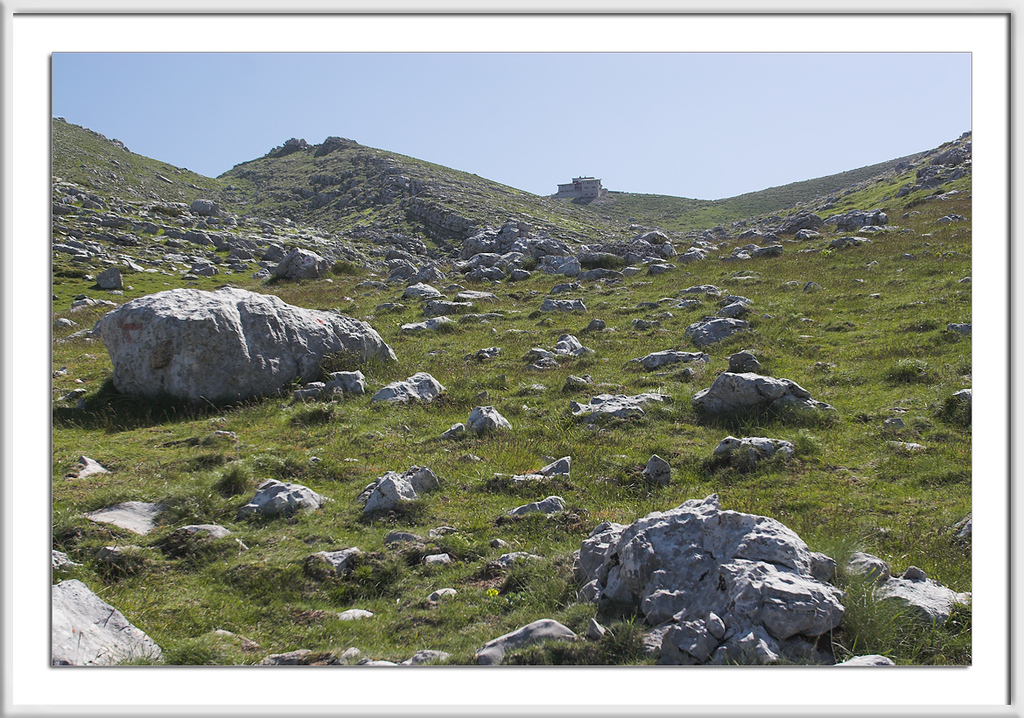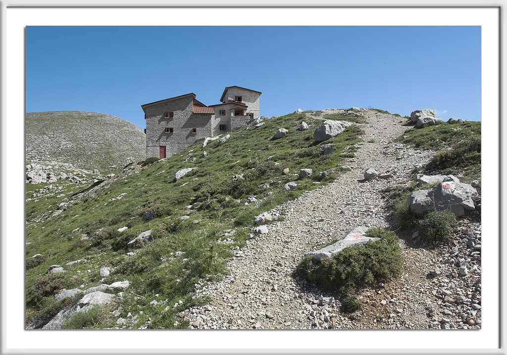 Als ich mal wieder den Kopf hob, schaute die Schutzhütte zu mir herunter. Das Wort "Hütte" deutet an der Wirklichkeit vorbei. Es ist schon ein ausgewachsenes Haus aus Stein, auf der Hangseite drei Stockwerke hoch.