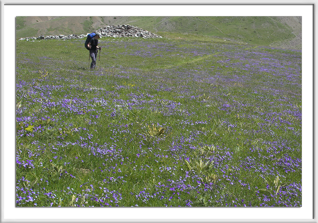 Die Jahreszeit war für die Wanderung wie geschaffen, im uns umgebenden Blumenmeer waren alle Farben vertreten. Wie macht die Natur das bloß, daß das so gut aussieht? Wenn ich zuhause in dieser Farbkombination die Wände streichen würde, liefe sicher jeder davon.