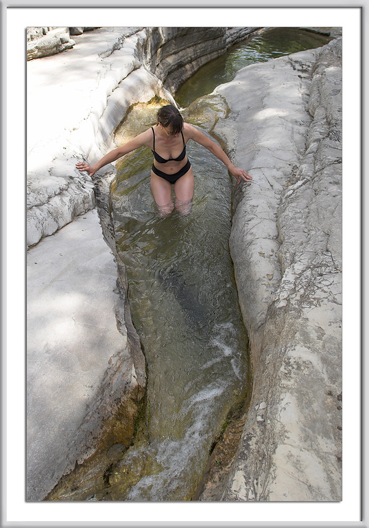 Ein kleiner Bergbach hat in das geschichtete Felsgestein wunderschöne Rinnen und Gumpen gegraben, in welchen sich vortrefflich baden läßt.