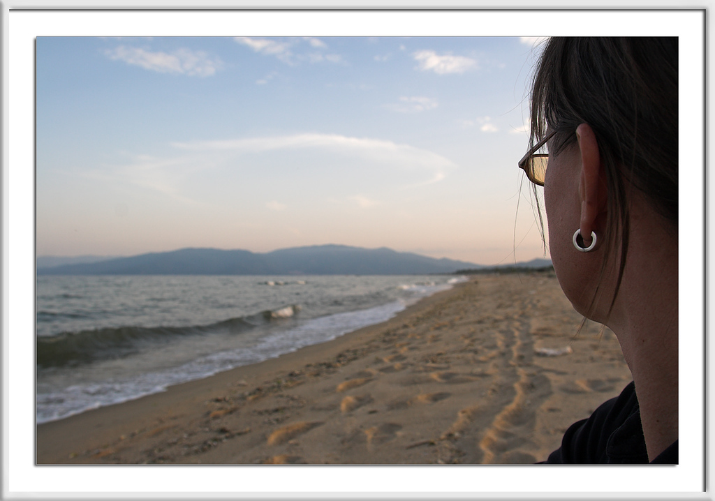 Der Blick nach rechts zeigt den Beginn der Ostküste von Chalkidiki und Spuren im Sand, von denen sicher nicht wenige von den zahlreichen Hotels der Stadt hierher und wieder zurückführen.