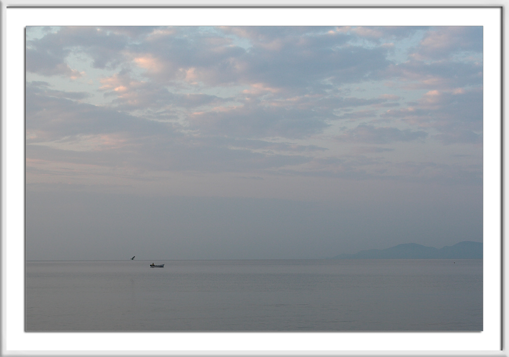 Die Sonne war noch hinter dem Horizont, so früh war es, das Meer war ruhig wie ein See, ein Fischerboot tuckerte vorbei, erwartungsvoll von einer Möve begleitet.