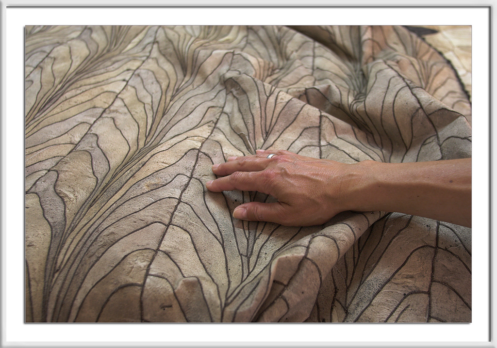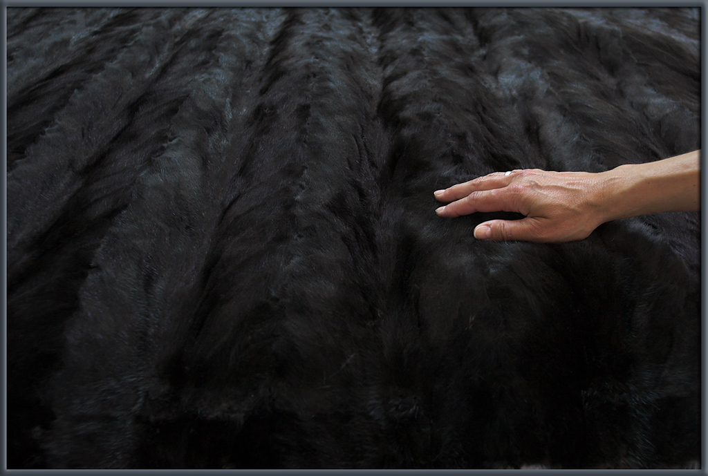 In der Mitte des Raumes lagen die fertigen Produkte: Rechteckige Felltafeln, jede nicht ganz 2qm, aus unzähligen kleinen bis kleinsten Fellschnipseln zusammengenäht.