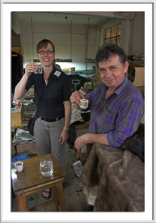 Wenn man sich die Preise der fertigen Designermäntel ansieht, die in umliegenden Geschäften angeboten werden, kann man nur schwer glauben, daß die weiter oben gezeigte Tafel aus schwarzen Fellresten nur 300 Euro einbringt.