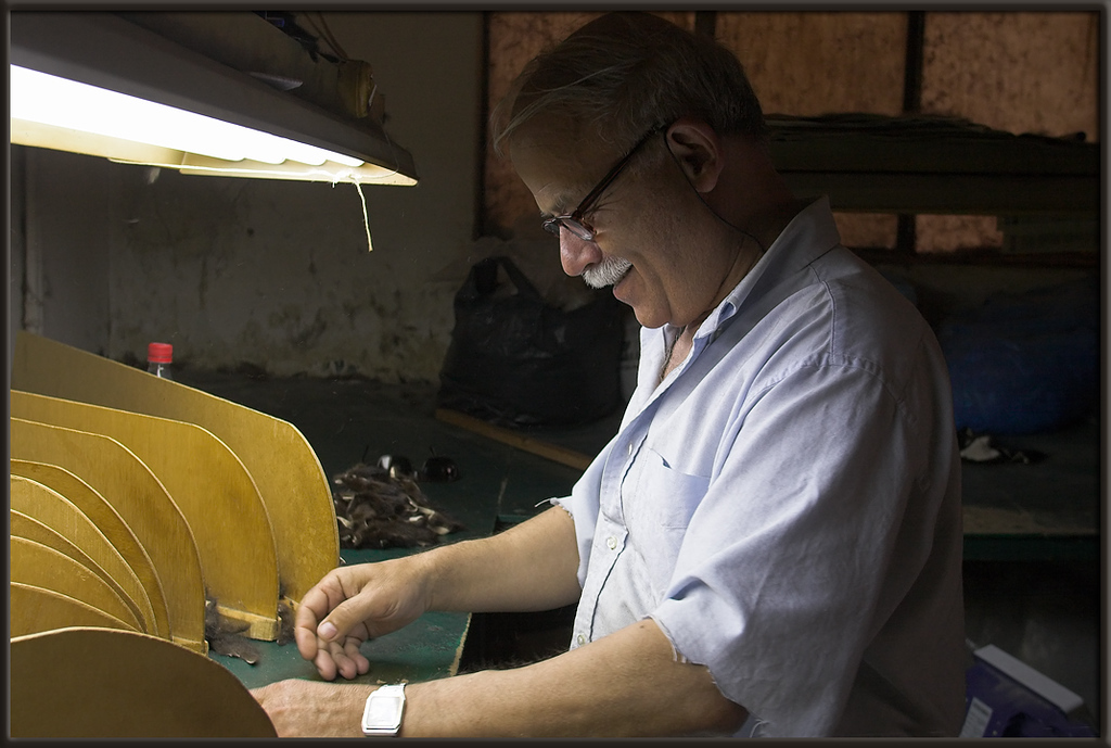 Diesem Herrn hier kam die besondere Aufgabe zu, einen Haufen Fellschnipsel in die Fächer für 10 verschiedene Farbnuancen zu sortieren, für mich sahen alle Schnipsel gleich aus.