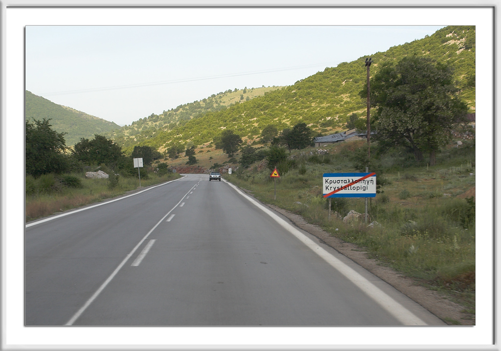 Wir erreichen Krystallopigi und ehe man den Gedanken verarbeitet hat, daß dies die letzte griechische Siedlung vor der Grenze ist, kommt auch schon das Ortsende-Schild.