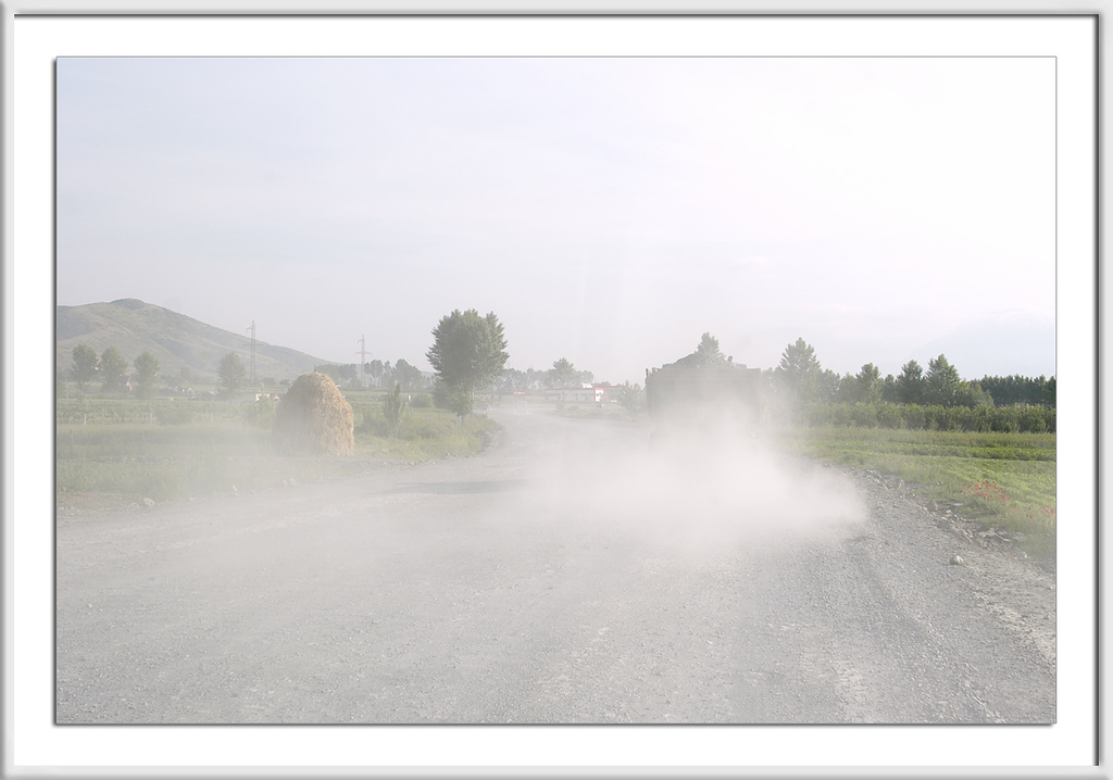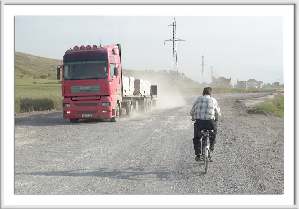 Hier war alles unterwegs, Laster, Autos, Pferdefuhrwerke, Fahrradfahrer und Fußgänger, und immer mit dabei, der Staub.