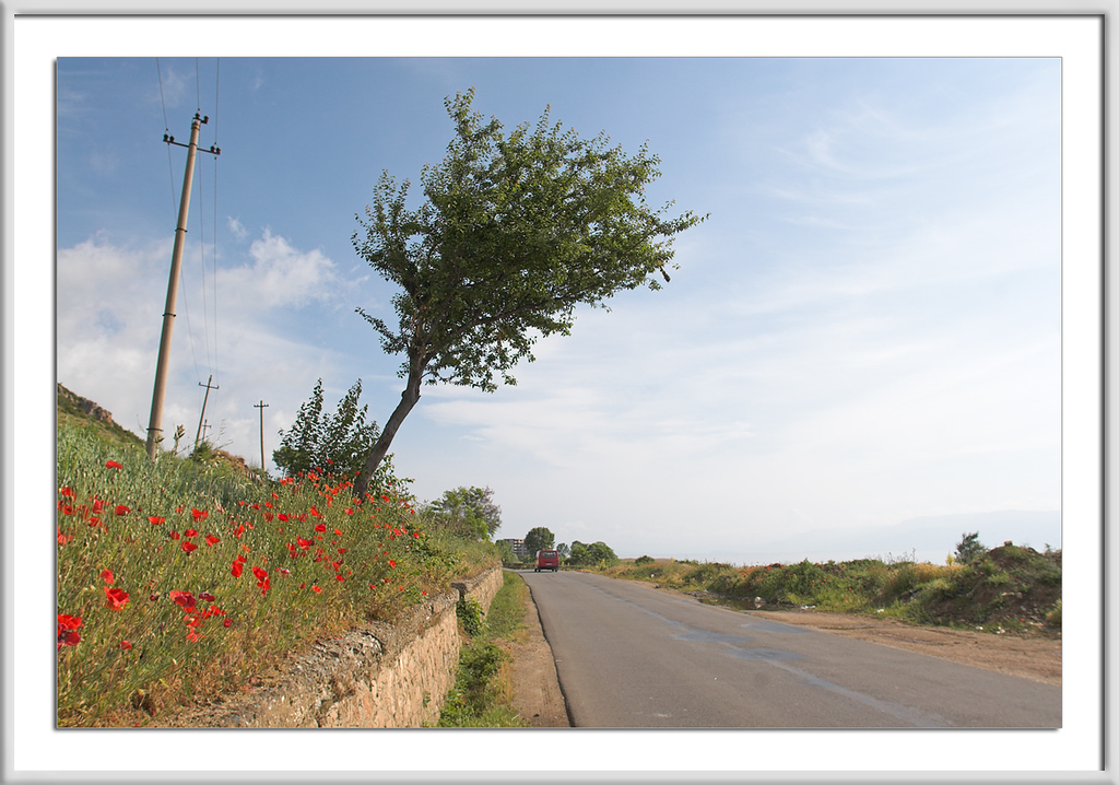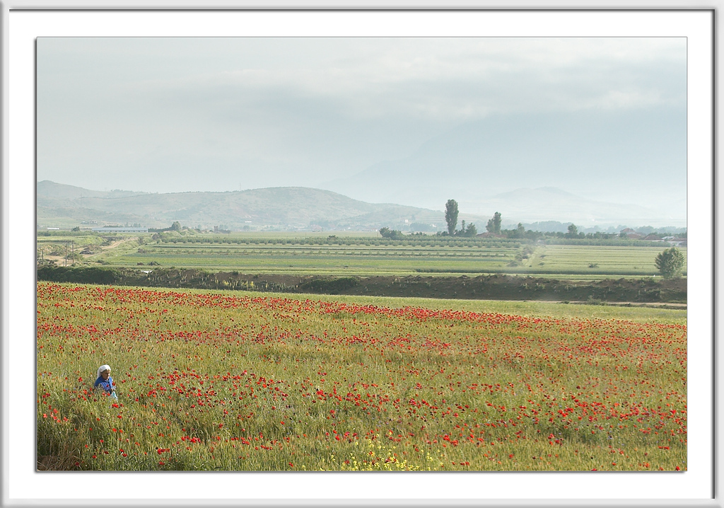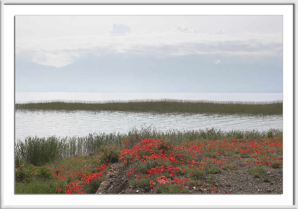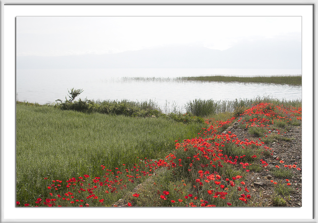 Westlich des Ohridsees war das Wetter trübe, an den Bergen bildeten sich Wolken, der See lag da wie flüssiges Silber und das kräftige Rot der Mohnblumen leuchtete in einer Intensität, die sich leider nicht photographieren läßt.