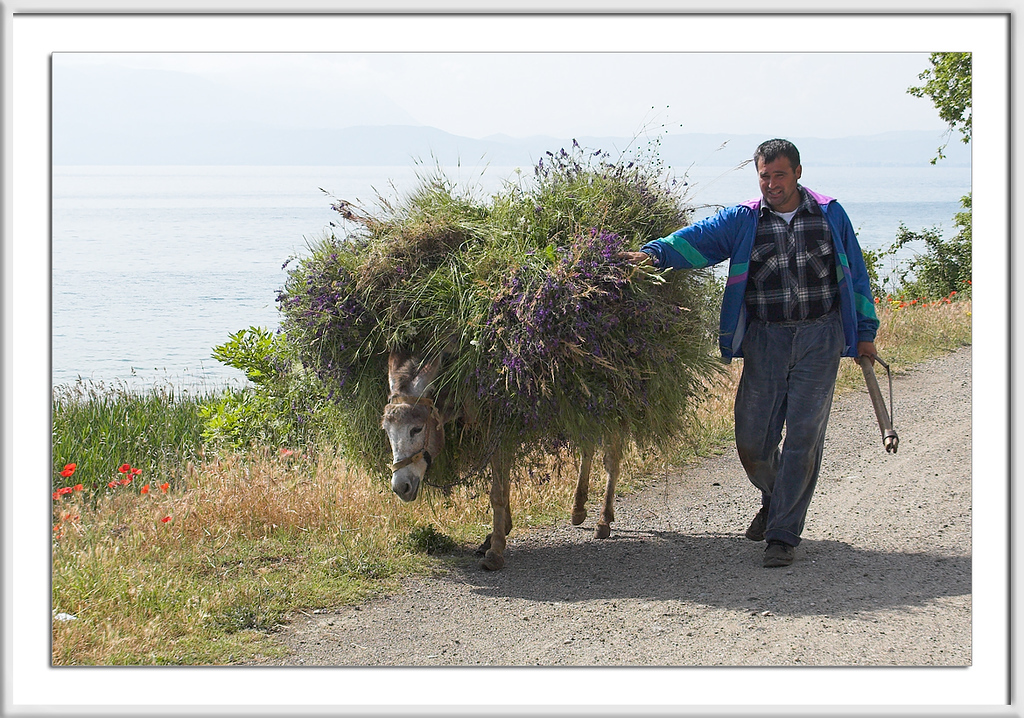 "Hast du eben den Esel gesehen?" frug ich, schon nach einer Möglichkeit zum Anhalten spähend. Ich mußte mich beeilen, ich wollte den Blumen- und Grastransport von "vorn" ablichten, und der Esel kam immer näher. Photoapparat? Hier. Schuhe? Mist, wo sind die Schuhe?