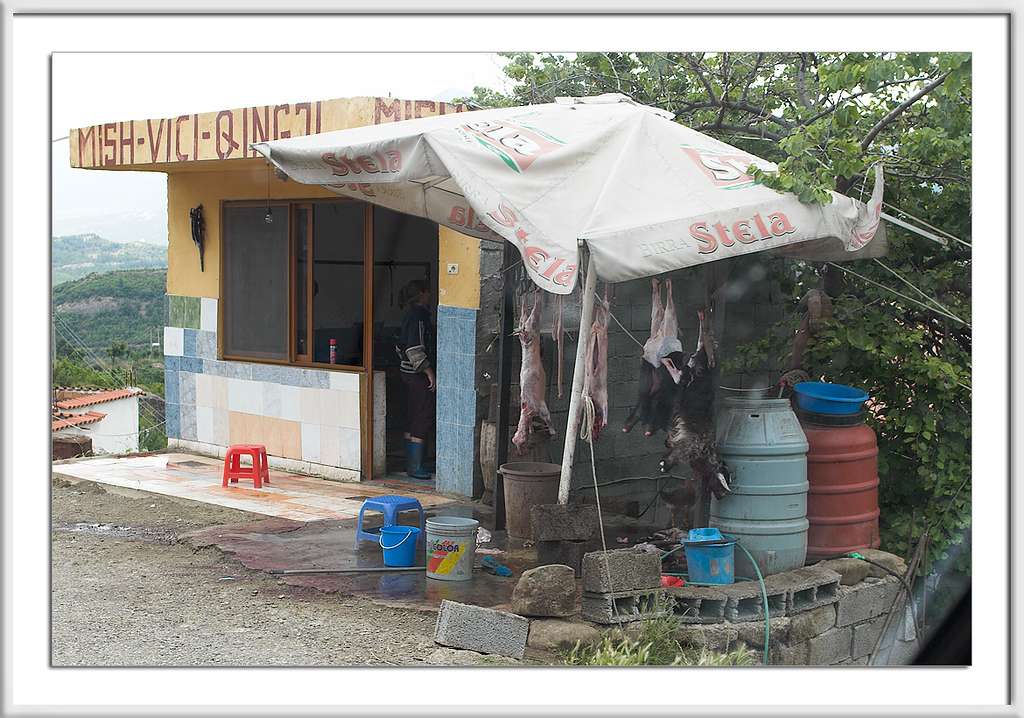 Nicht viel später verließen wir den Bergkamm und wieder einmal ging es in Serpentinen nach unten. In einer Rechtskurve entdeckte Waldameise eine sonderbare Hütte, direkt am Straßenrand. Bei genauem Hinsehen entpuppte sich der Bau als Metzgerei, ja, wir essen Fleisch gerne, aber die toten Tiere zu sehen trübt diesen Genuss ganz erheblich.